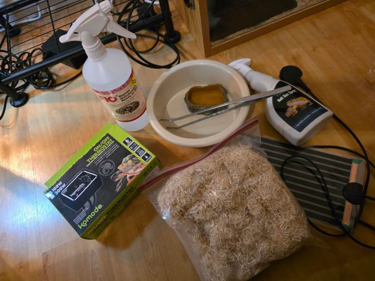 Comes with thermostat, heating mat comes with habistat heat mat controller for temperature, iI have some pinkie mice frozen, water dish, aspen bedding in a bag (spare) tongs/tweezers for feeding a big bowl for feeding, a house, and a new heating mat used once only (spare) and a brand new (spare) thermostat and x2 cleaning sprays. Extra water dish included. Comes with heat resistant/heat tape to tape down heating mat to keep it secure.
