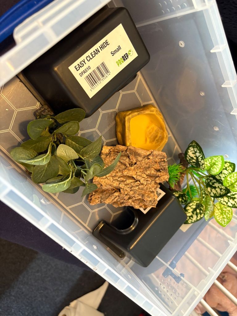 comes with 2 small hides Also a small water dish and some decor With lid of course.