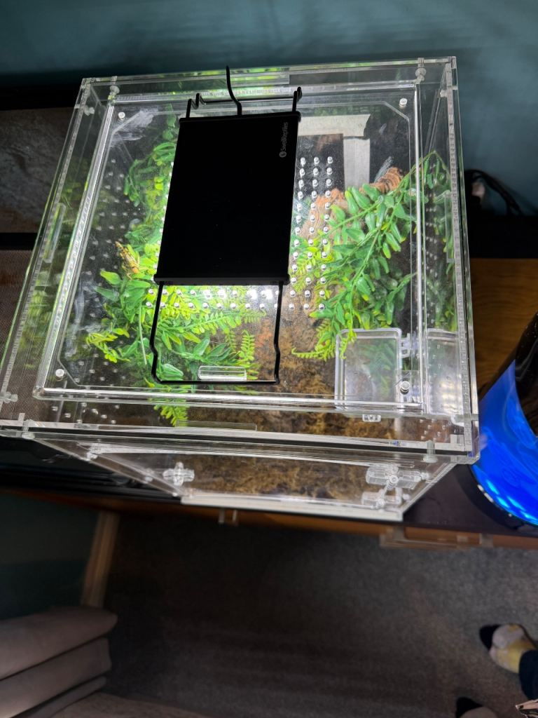 Swell terrarium size dimensions 30.5 x 30.5 x 45.7cm…fully kitted out with substrate, moss, cork bark, artificial plants, heat pad, Powerful 6W LED light, 2 1/2 female ornamental Indian tarantula