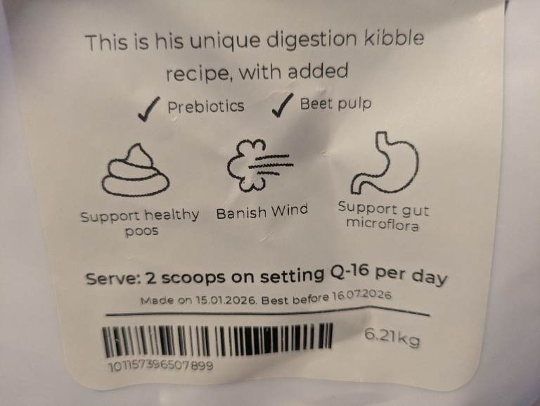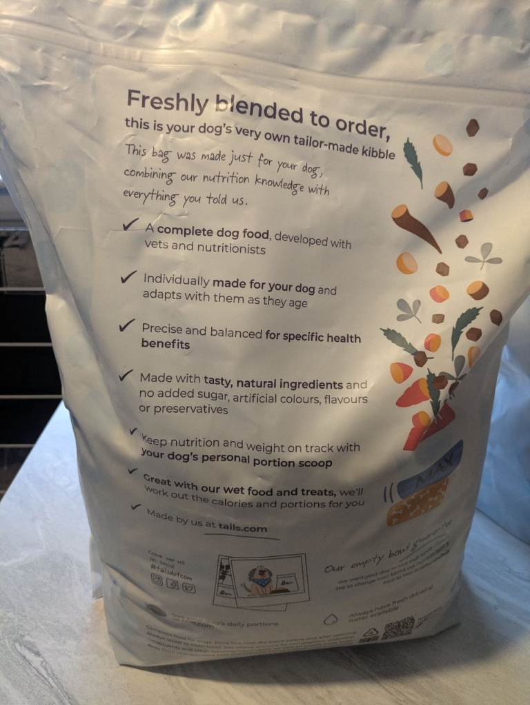 2 bags of tails dog kibble. 1 bag is sealed and the other bag is opened but only a small amount of kibble used out bag. The kibble supports healthy poos, banish wind and supports gut microflora. Ideal for someone that already uses tails. Collection only