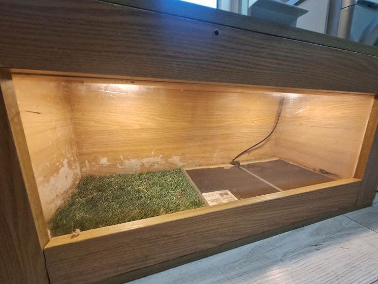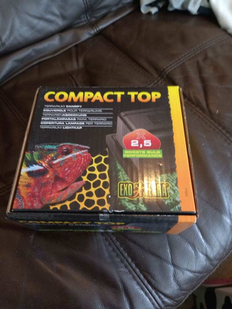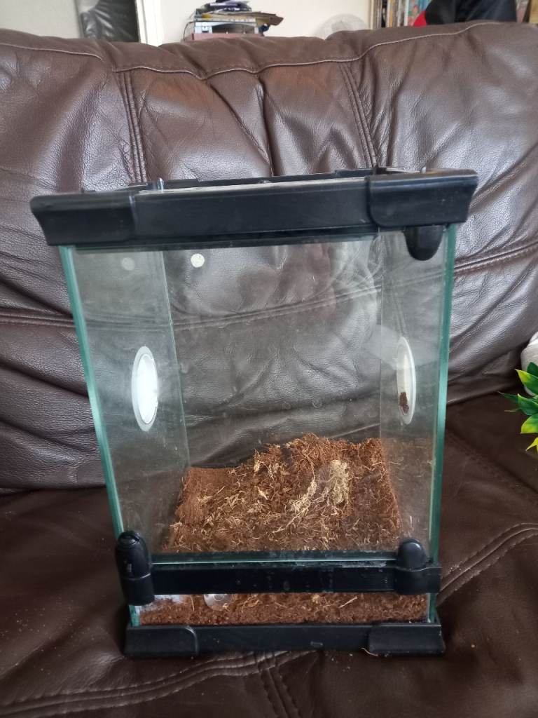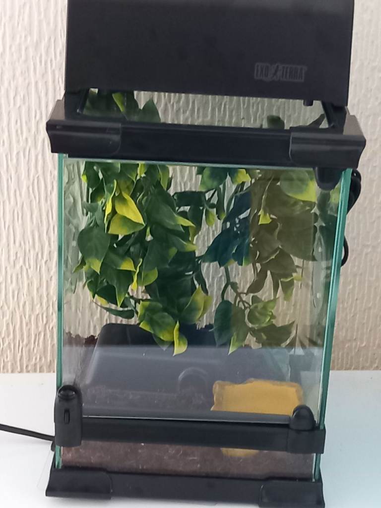 Terrarium for small frog ,reptile etc.Co.es with new compact canopy,light bulb for basking,2 different size baths with suction cups,plastic plant,new water dish with steps so live food can escape,humidity thermometer