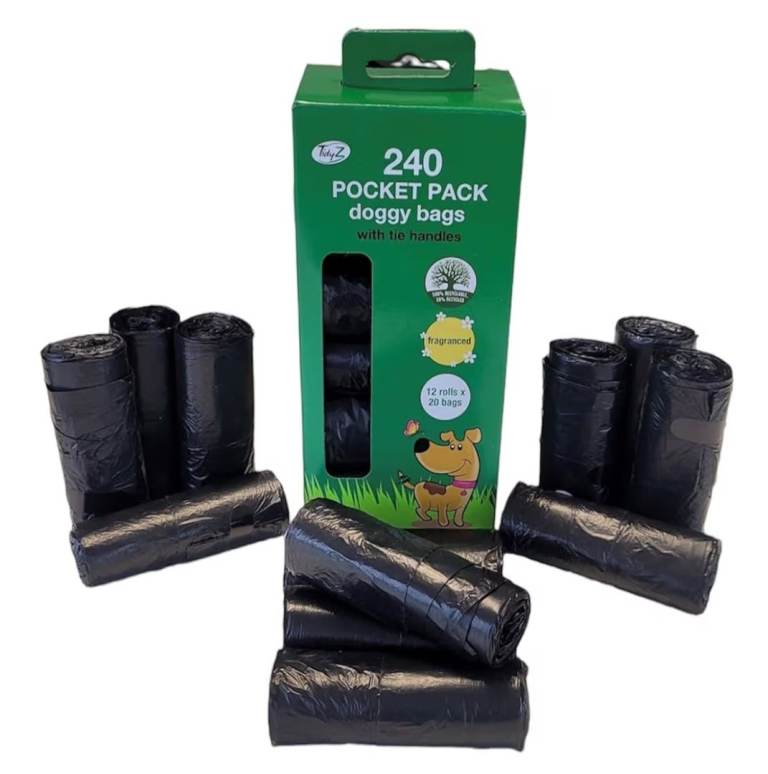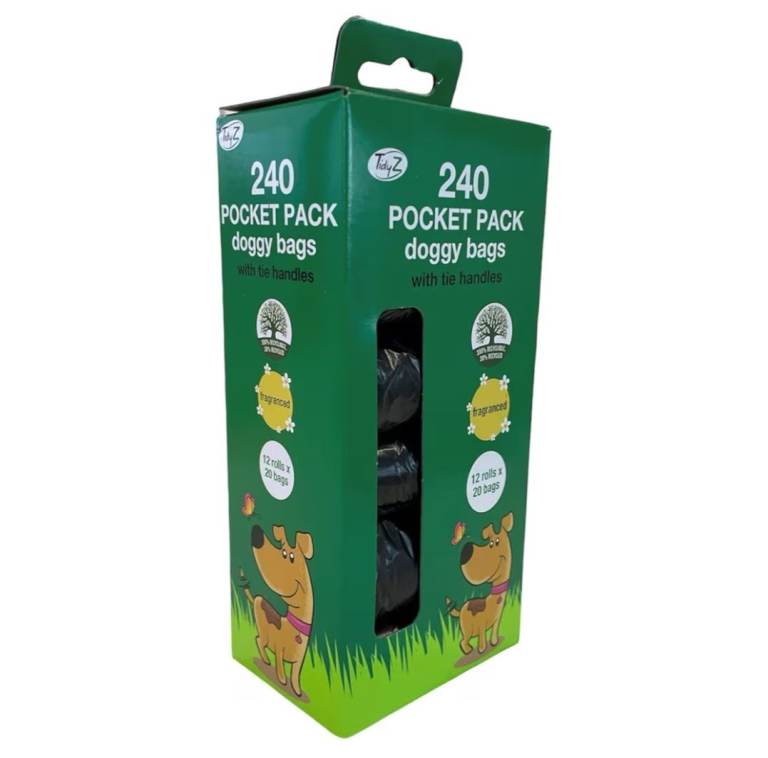 240 TidyZ Dog Poo Bags. Minimum 30% Recycled Plastic. Strong, Large Pet Waste Bags. Tie Handles. Individual Pocket Packs. Scented. Leakproof. 12 Rolls of 20