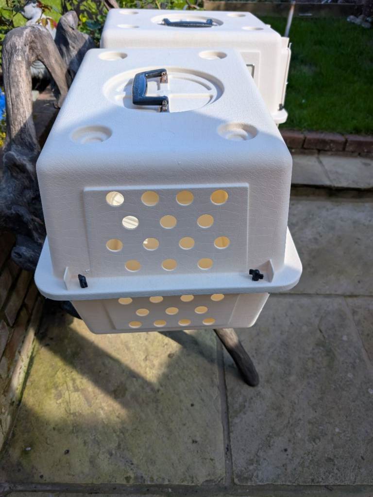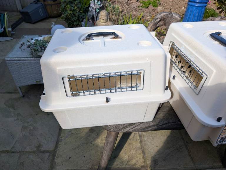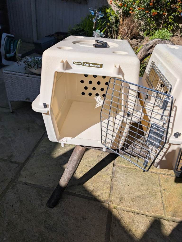 £26 each or £48 for the pair. Vari Kennel fully compliant IATA approved for airline use pet carriers. Convenient tie-down strap holes allows to zip-tie the kennel together for added security during airline travel. An easy-open secure squeeze latch, metal side vents to promote air flow.