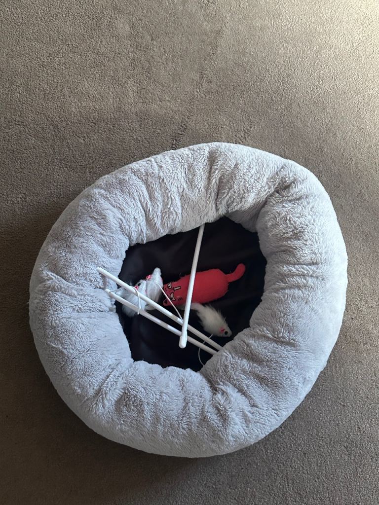 Unused litter trays, two bags of litter, unused dishes and cat shampoo. A pretty unused cat bed and completely unused toys.