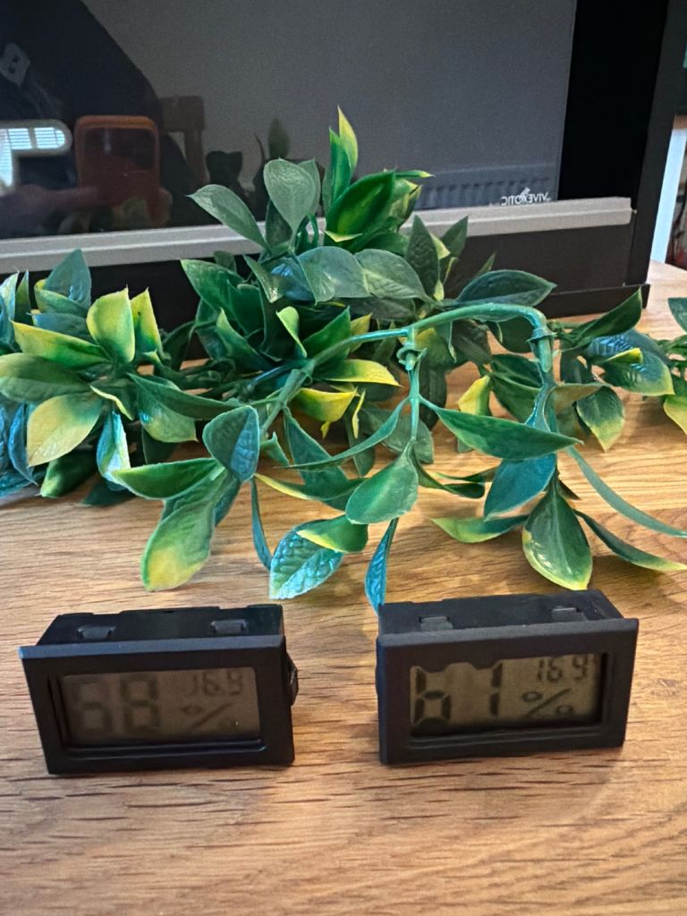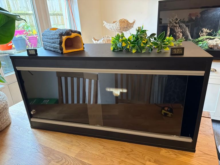 Black Vivexotic 86cm length, 42cm high, 38cm wide. Very good condition, only used for a short time. Two digital thermometer/ humidity