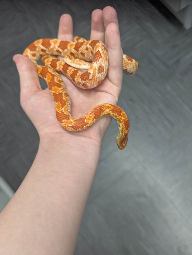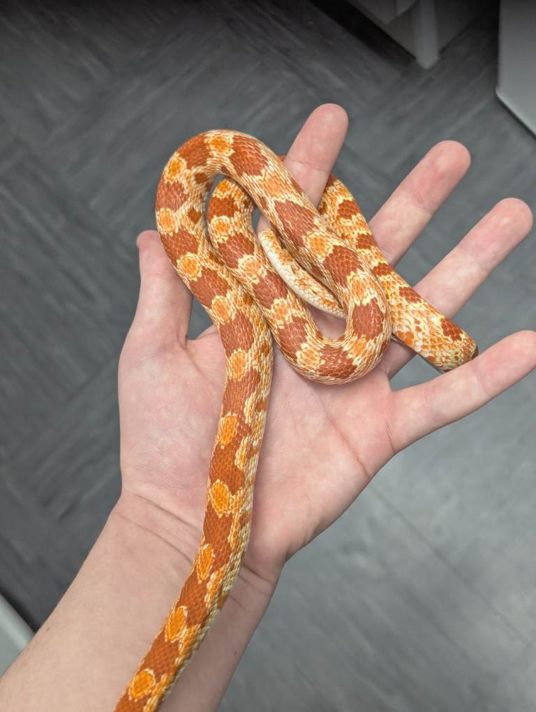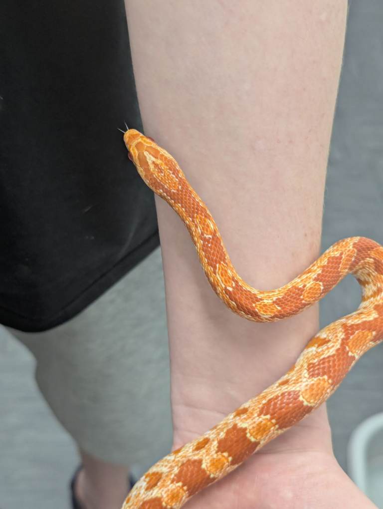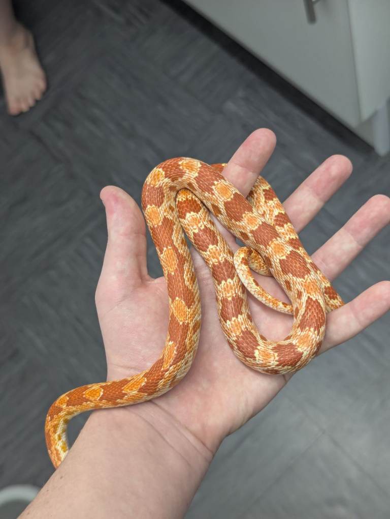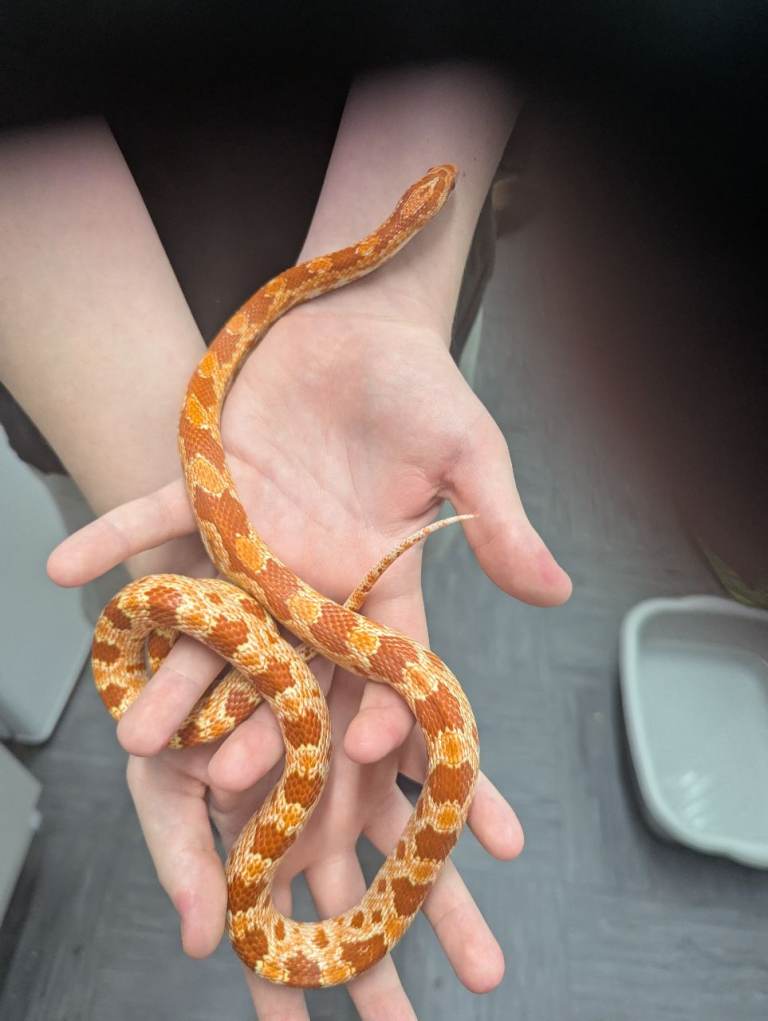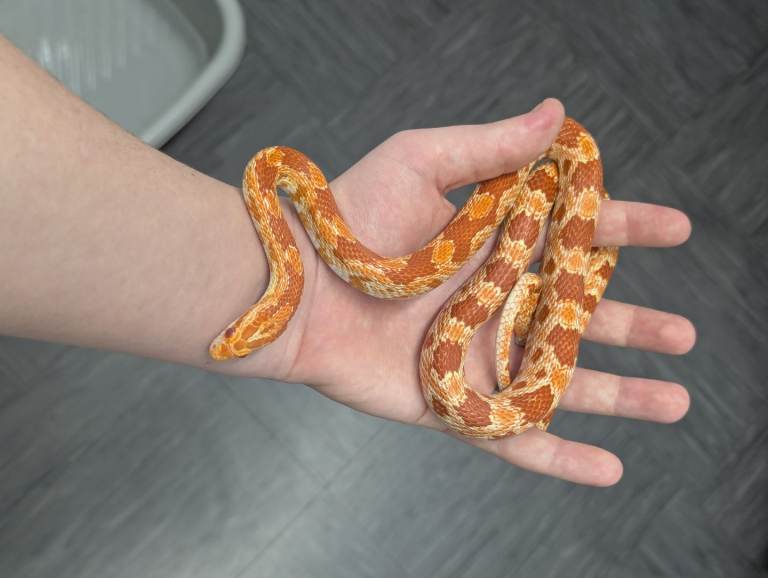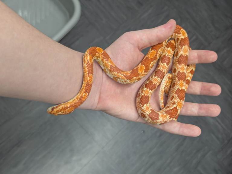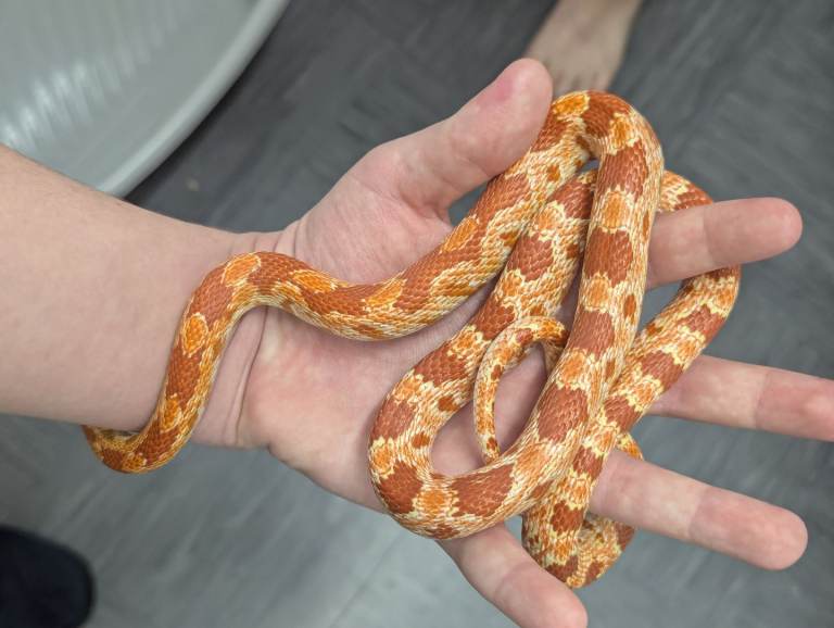 Young corn snake, eating one small defrosted mouse once a week. Sheds and poops as it should do. Friendly and easy to handle. Comes with a nice clean vivarium that's in immaculate condition, £85.