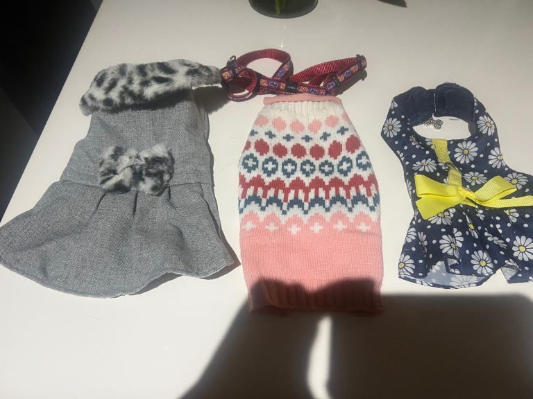 selling these lovely dog outfits/dress/harnesses, as now too small for my dog now, pics dont do the outfits justice ,theres raincoat, summer dress and hat, coats , dress, harness, and basically new dog bed , sell all for £15, pick up oxgangs