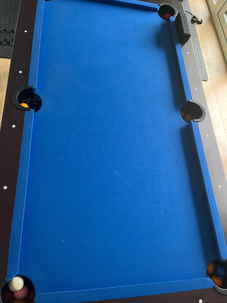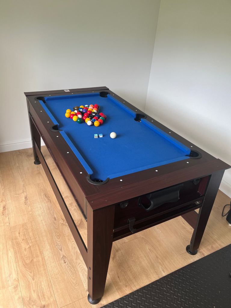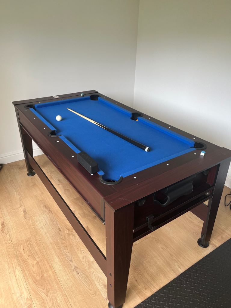 2 in 1, 5ft games table. Robust and sturdy with high quality blue baize snooker surface, mains powered fan and pvc air hockey surface. Comes with a selection of adult and children’s snooker cues, snooker and pool balls, air hockey puck and 2 pushers. Very good condition, just a couple of tiny marks on mahogany frame.
