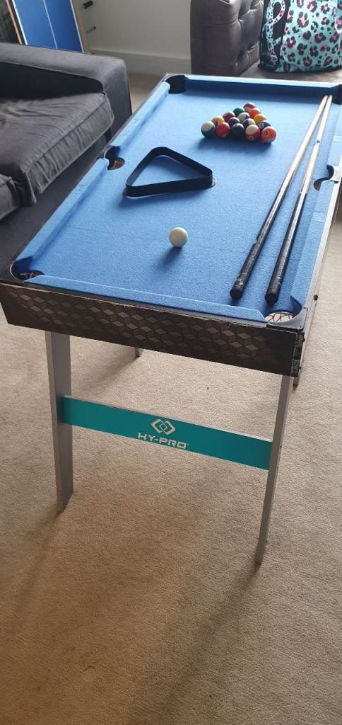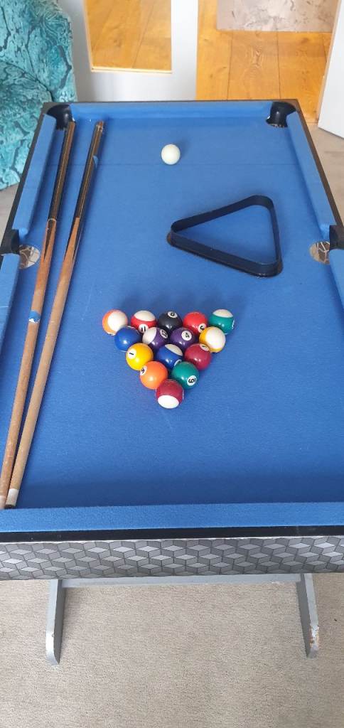 Good condition, snooker cloth and foosball sections good, some edges a bit worn. Comes with all snooker balls, triangle, 2x cues, balls for foosball. Snooker table approx 100x60cm. Folds up for storage. Collection from anniesland.
