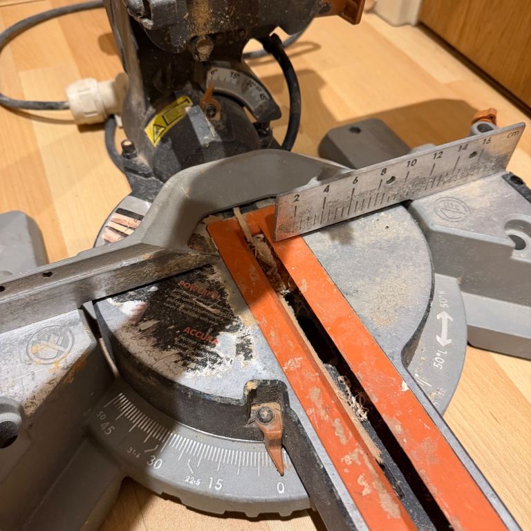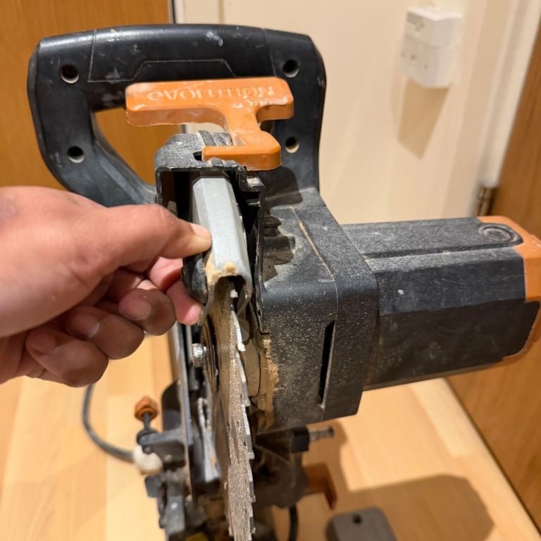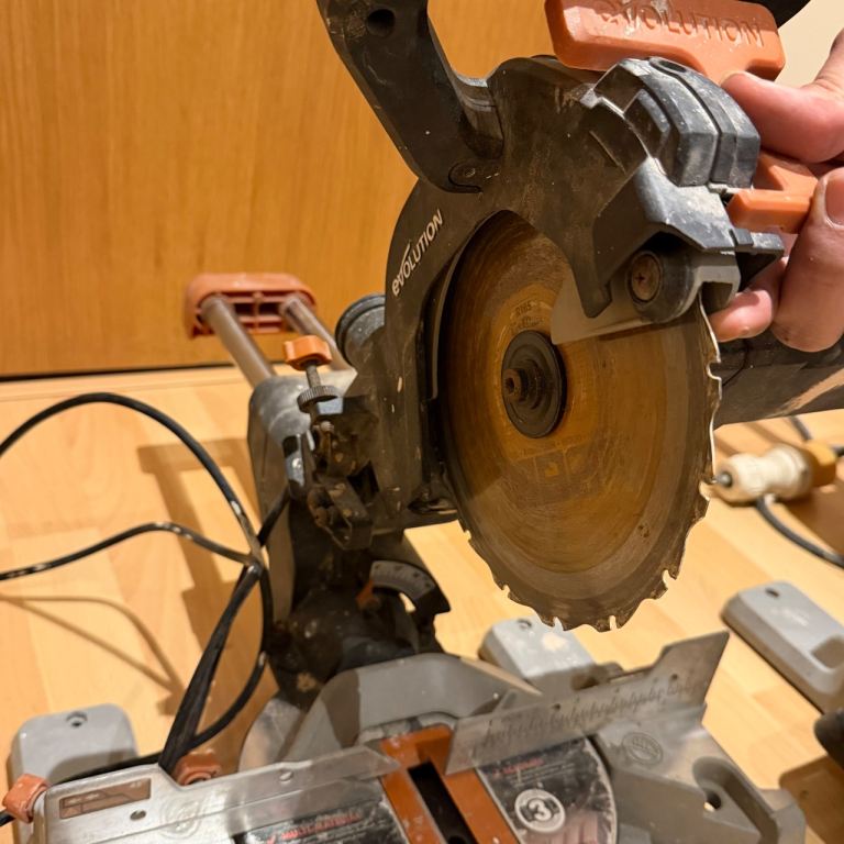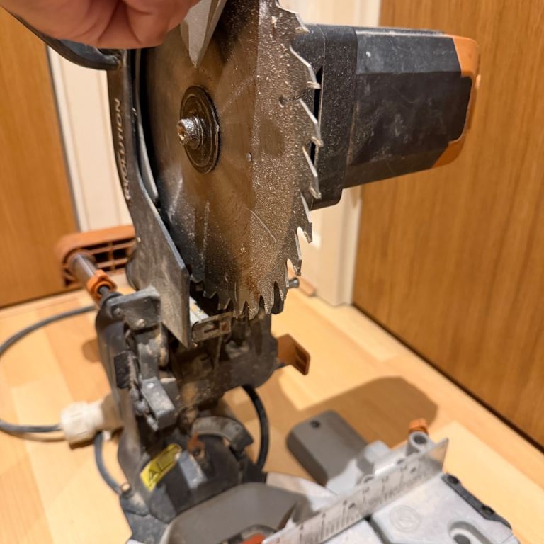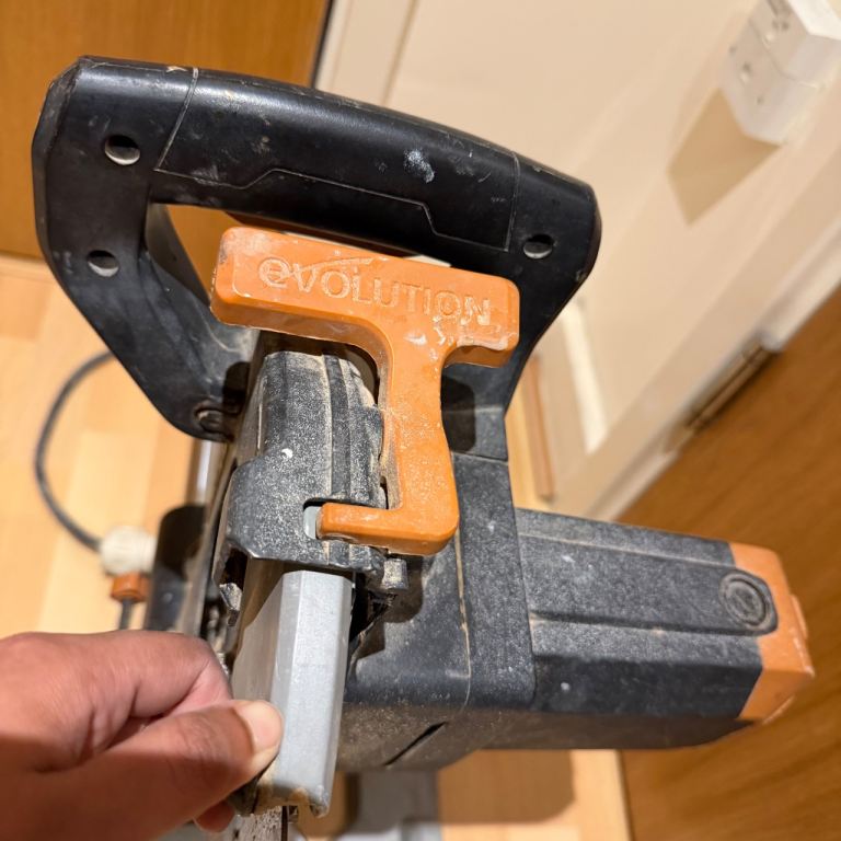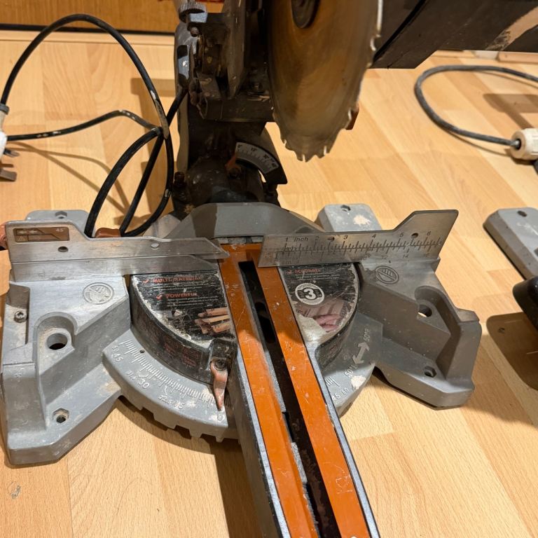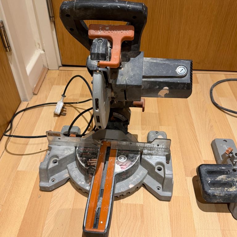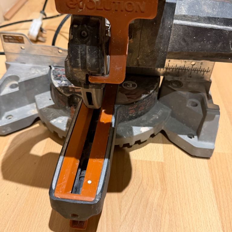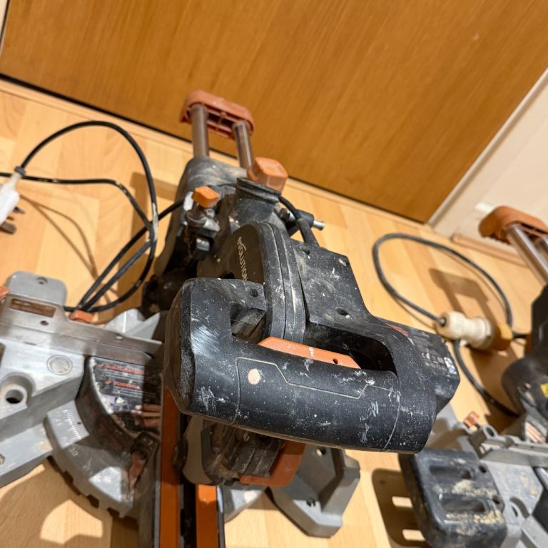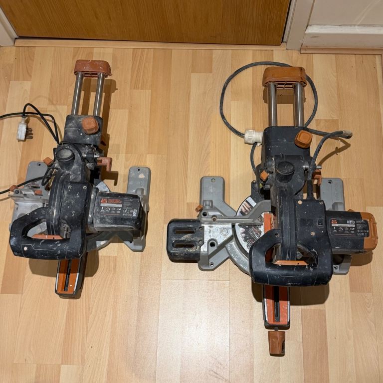 Pair of Evolution multi-material sliding mitre saws. These are being sold as a job lot, strictly sold as seen for spares or repairs. I have not tested these recently, and they show clear signs of heavy use, dust, and some surface rust on the blades.