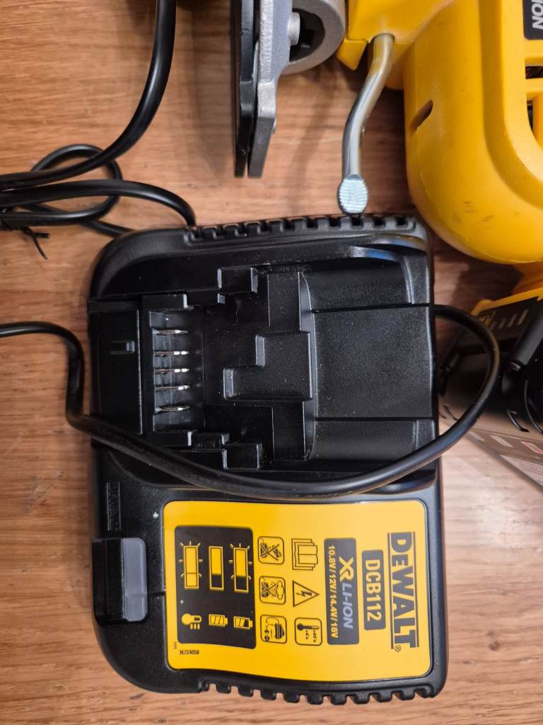 A 18v cordless dewalt jigsaw with a battery and a charger.