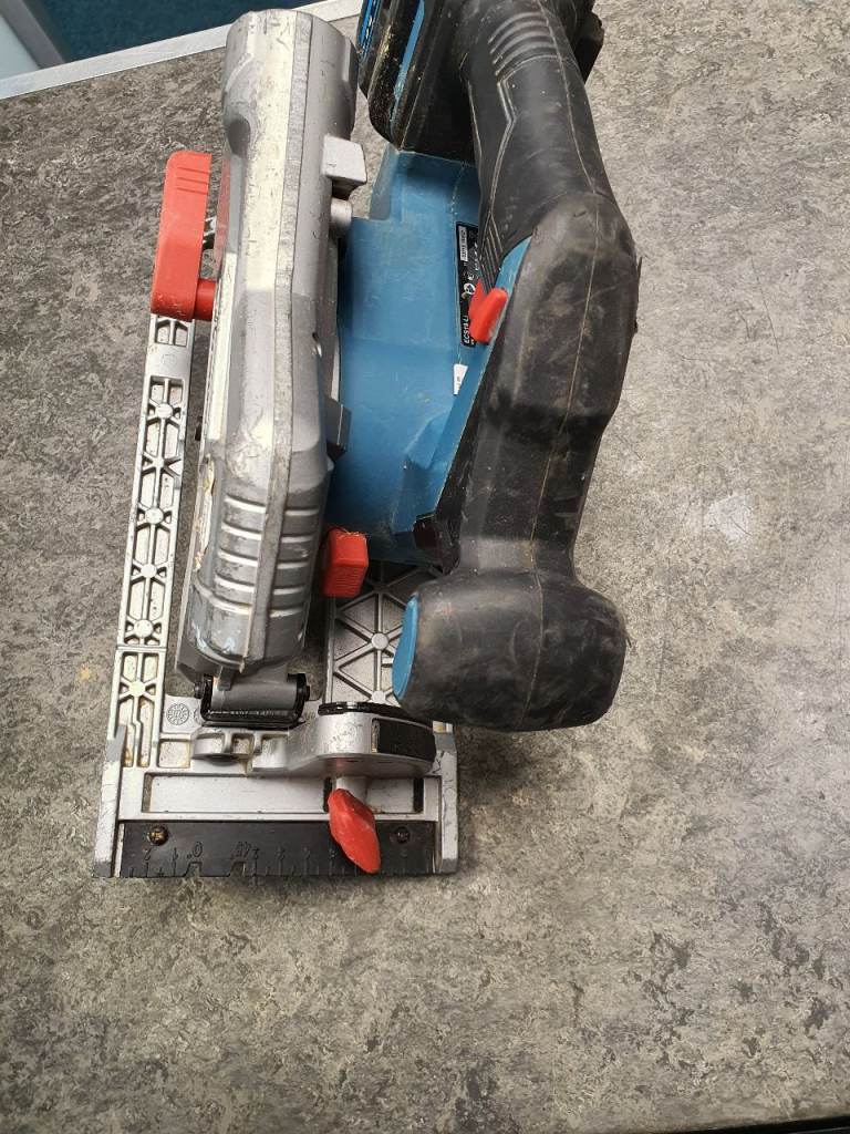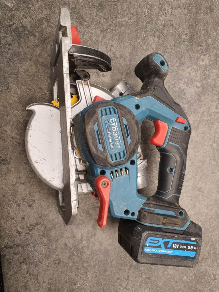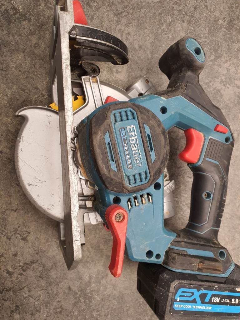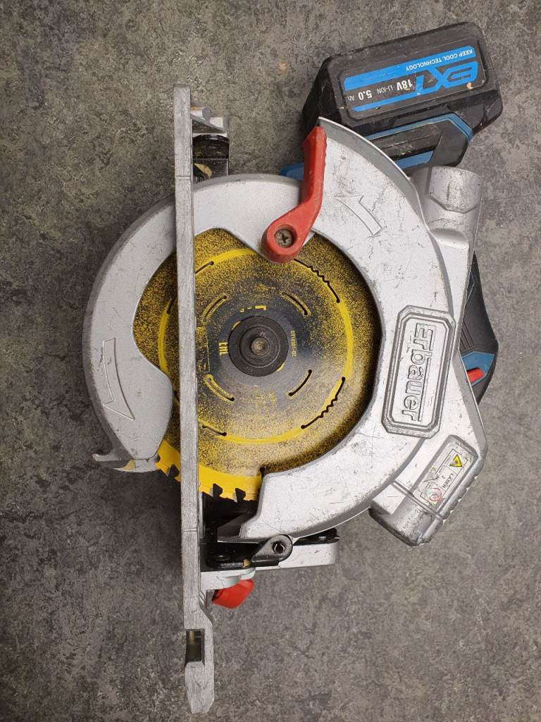Erbauer ECS18-Li 18V Brushless Cordless Circular Saw with 18v, 5.0A Battery, wear on body but in full working order, includes one blade.