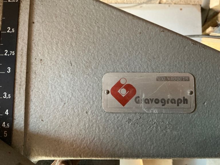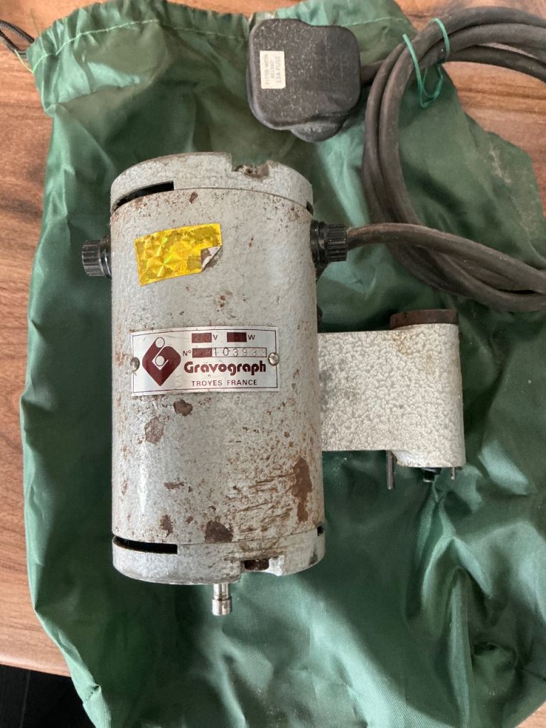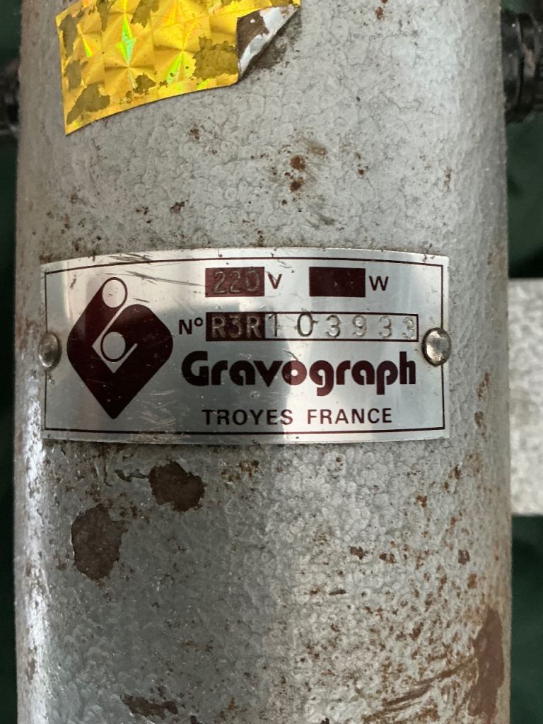 Gravograph rotary engraving machine in good condition for age , complete with spare motor , replacement belts and carbon brushes , two sets of letters , various stylus and other fixtures