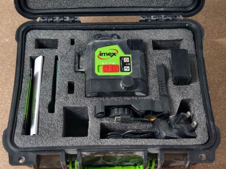 High-precision Imex LX3DG green multi-line laser level with strong visibility for indoor construction, partitioning, flooring and alignment work. Fully tested — bright, stable lines. Comes as a complete kit in the original rugged hard case.