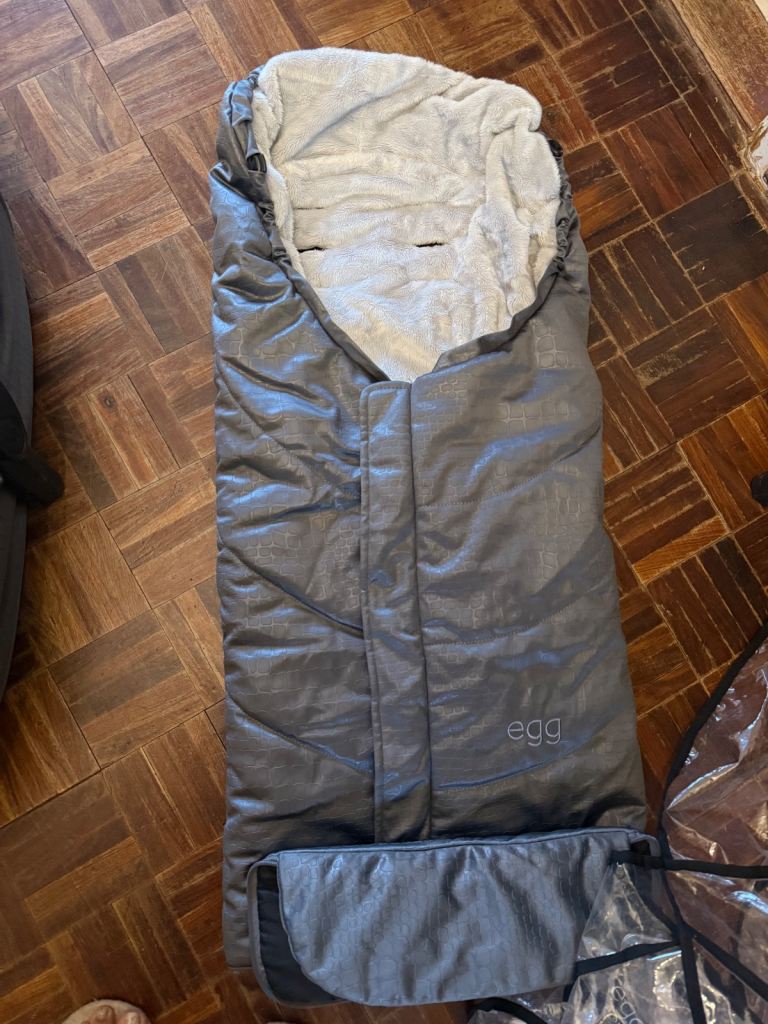 Includes two cozy fur liners (one grey, one cream, as pictured), a full-body footmuff, and an Egg stroller parasol.