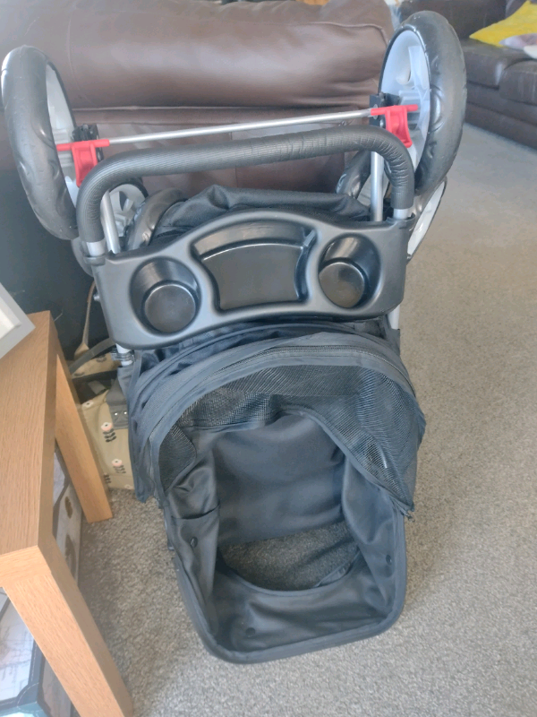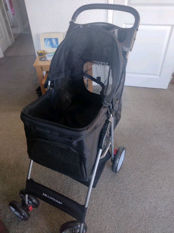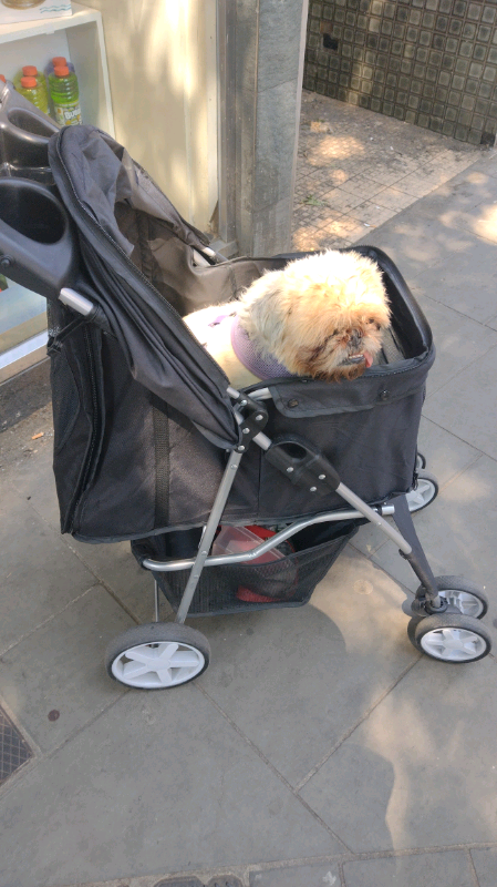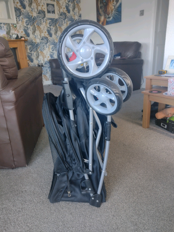 Dog pushchair with swivel wheels and underneath basket, fits westie, pug, Frenchie size dog, folds down for easier storage, as new condition