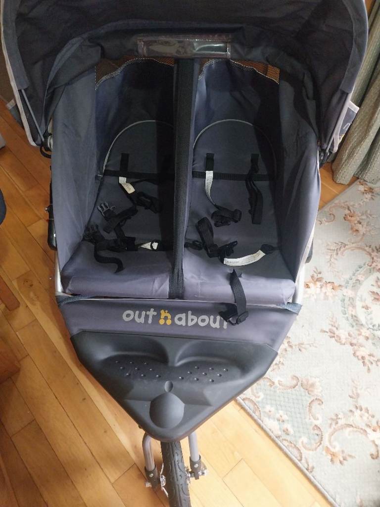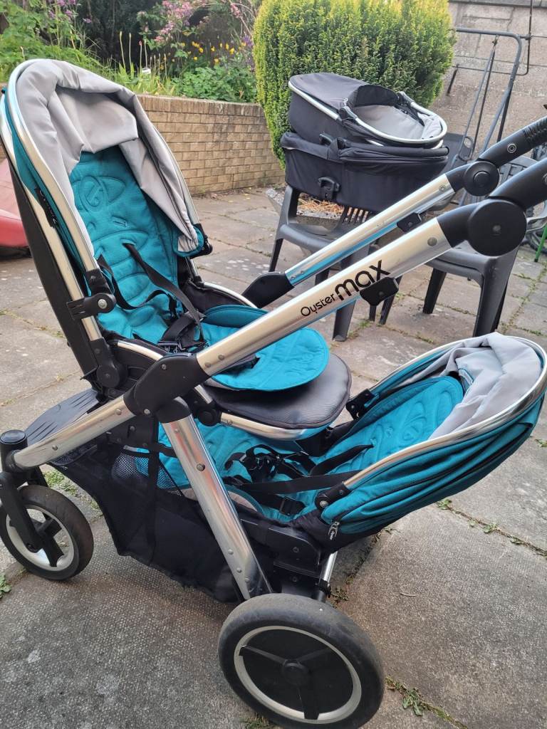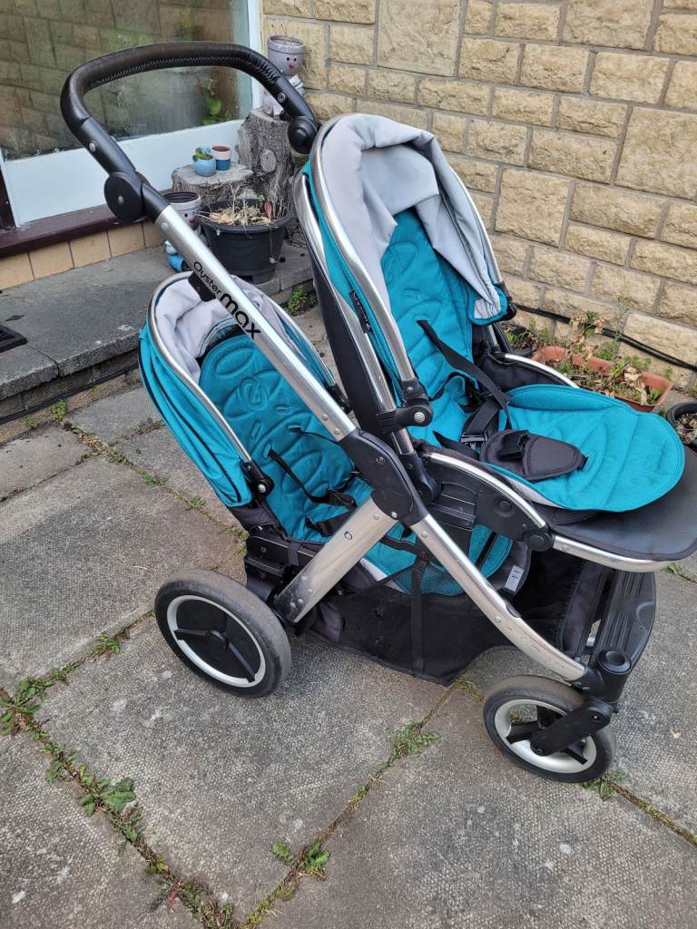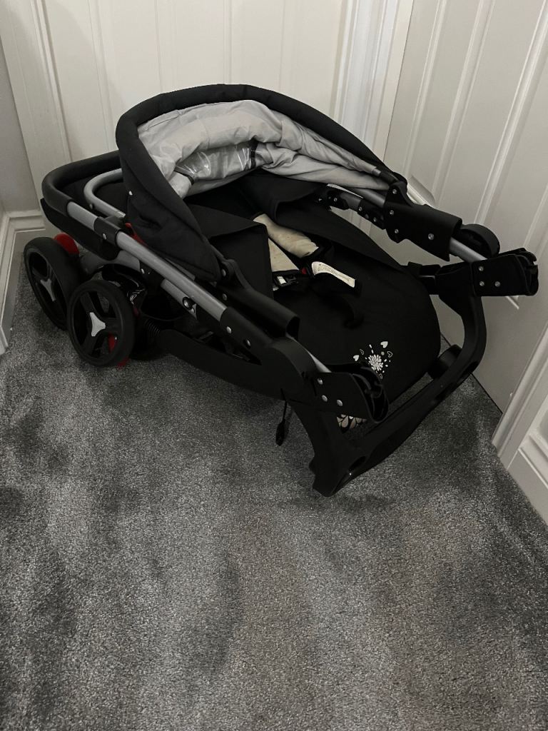 Double pram with bassinets, baby bag and rain covers, easy foldabe