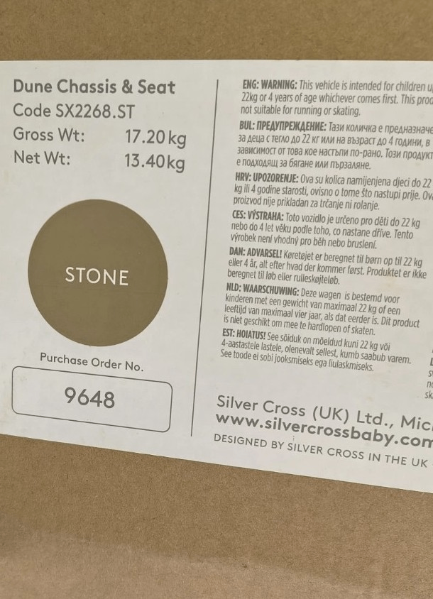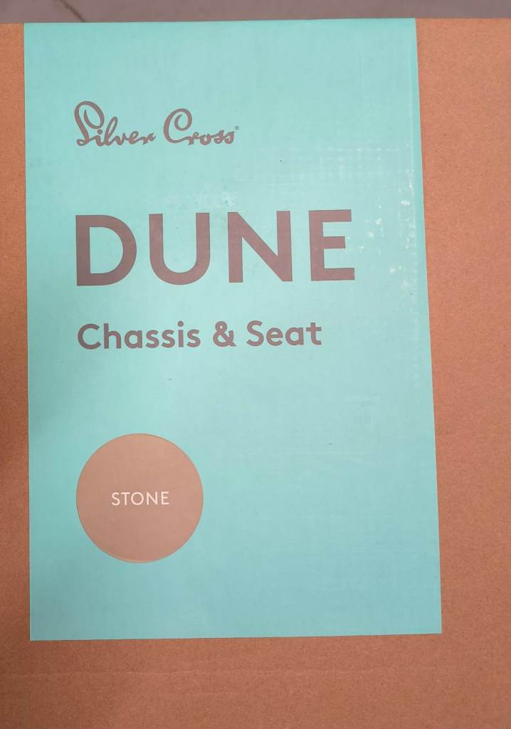 Dune silver cross chassis and seat stroller in Stone color, new and boxed