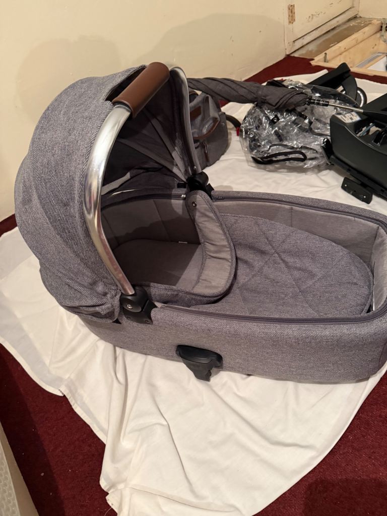 For sale mamas and papas occaro push chair bundle, including car seat and iso fix base, carrier cot, umbrella, cup holder, adapters for car seat to pram, rain cover, cup holder, baby bag (includes changing mat, pouch and bottle bag) and universal buggy board. Pram has been serviced and Valeted by Mamas and Papas (receipts included). The bassinet has been replaced by Mamas and Papas. There are a few scratches on the hood of the car seat (see photos). All items comes fully boxed in original boxes. Still in excellent condition.