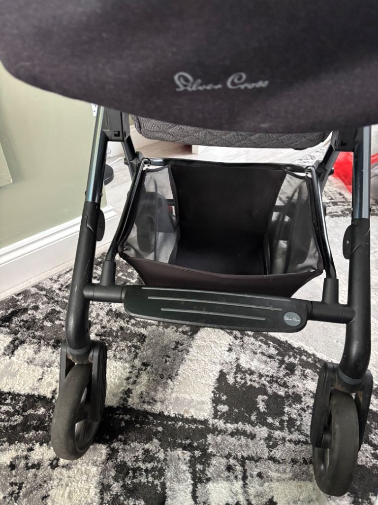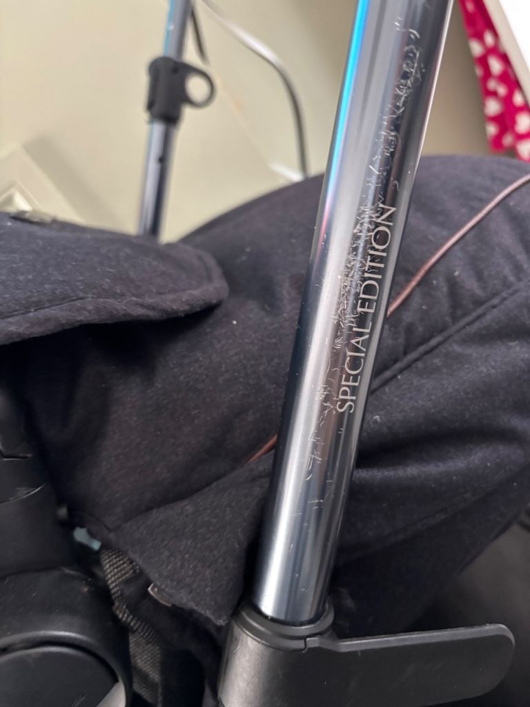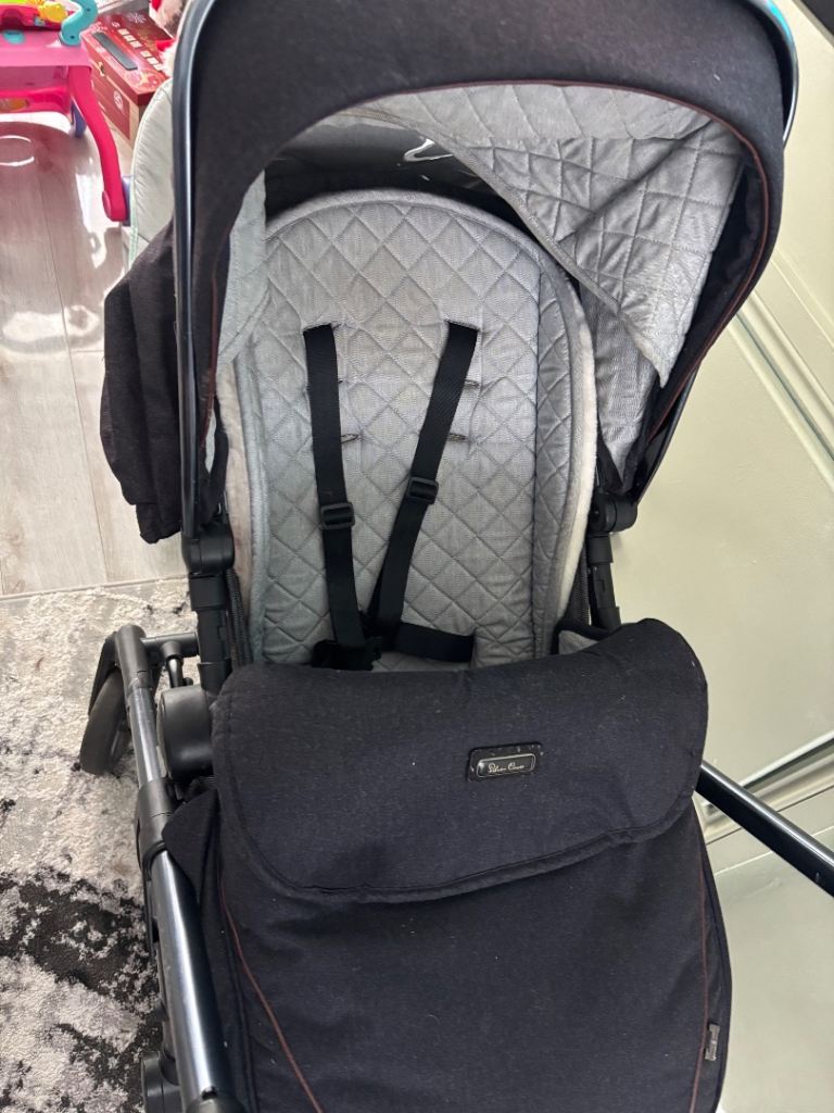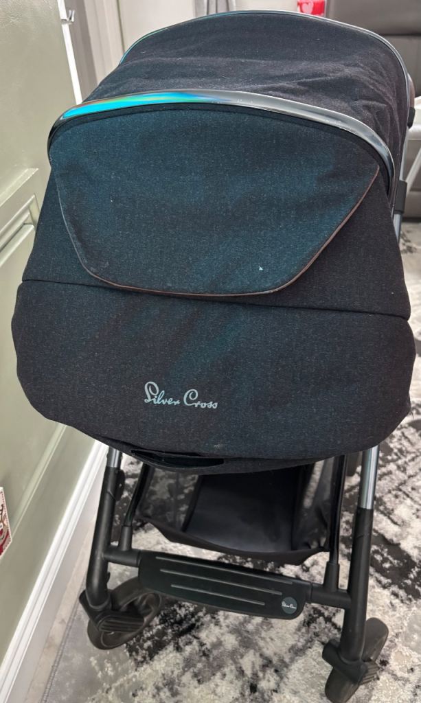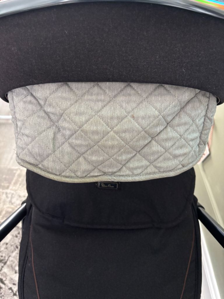 It’s in good condition but of course there is signs of use please see images. Also needing a wash down on the liner. The liner is reversible with thick lovely fur. Comes with silver cross bag, raincover and black Nuby umbrella also has clips for bags to be placed onto bar.