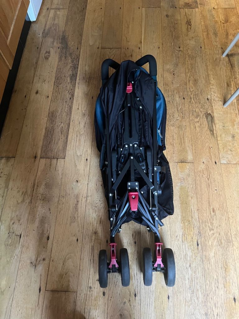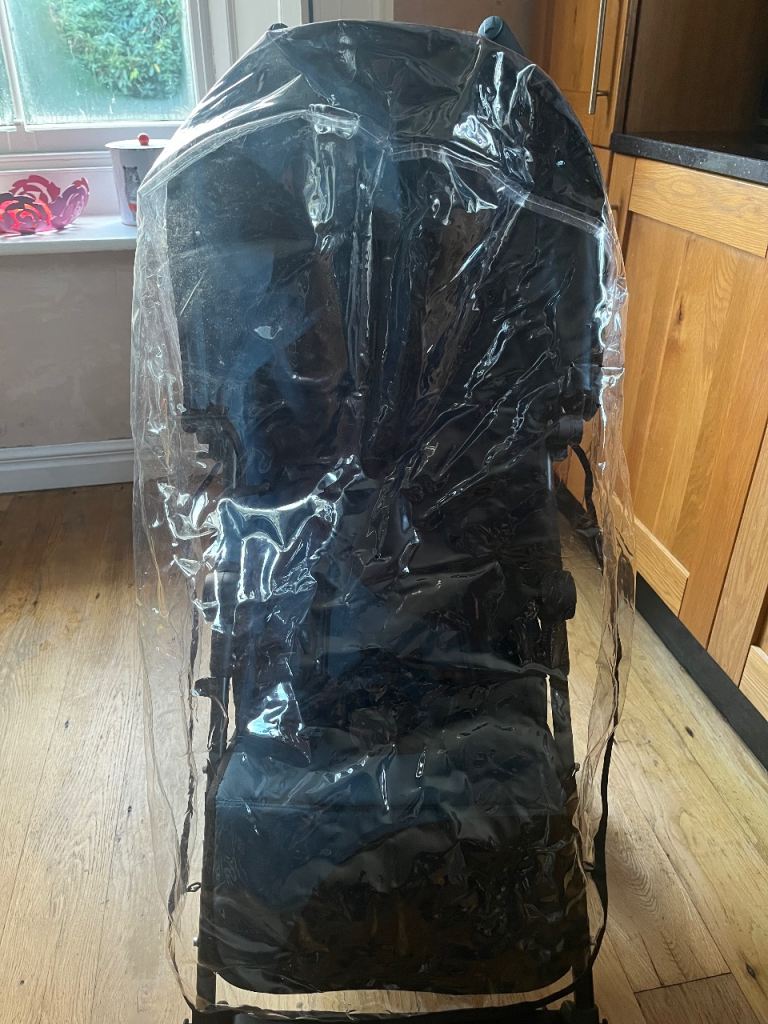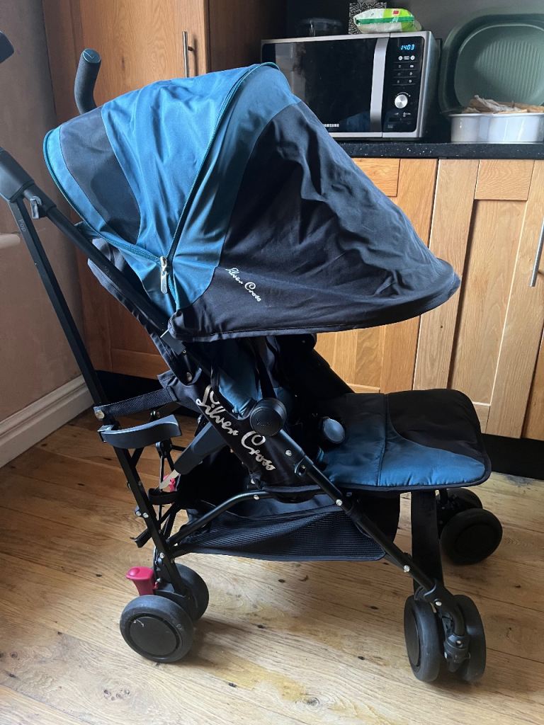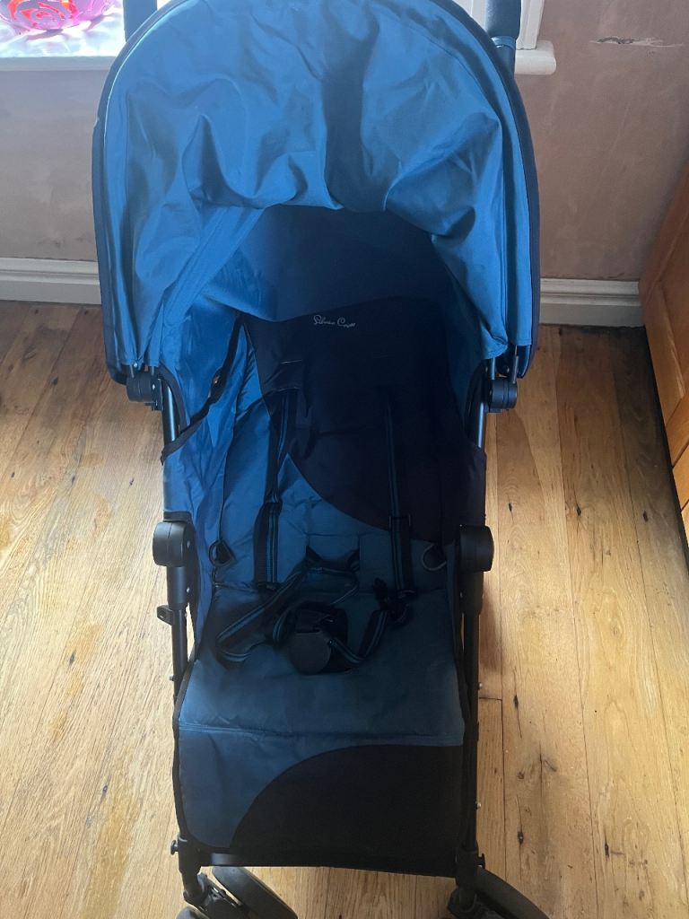 Silver Cross pop stroller with rain cover. Good condition. Black and blue with ventilated hood and adjustable rests for sitting and laying. Good condition no visible marks.