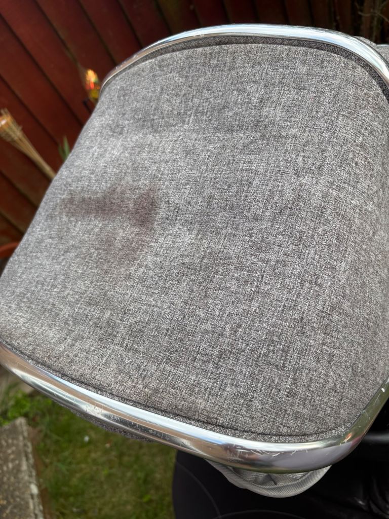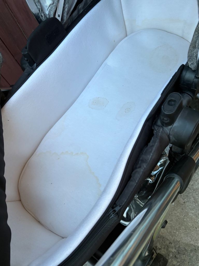 One mark on the hood from storage. Does not effect use. Also the mattress to the carry cot is stained from a spilt drink, has been washed. So either needs to be covered with a sheet or a new mattress. Which is about £10-£15 from Amazon.
