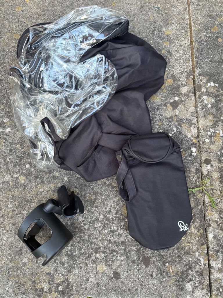 Includes car seat and adapters, cup holder, rain cover, changing bag/mat, bottle holders and different coverings.