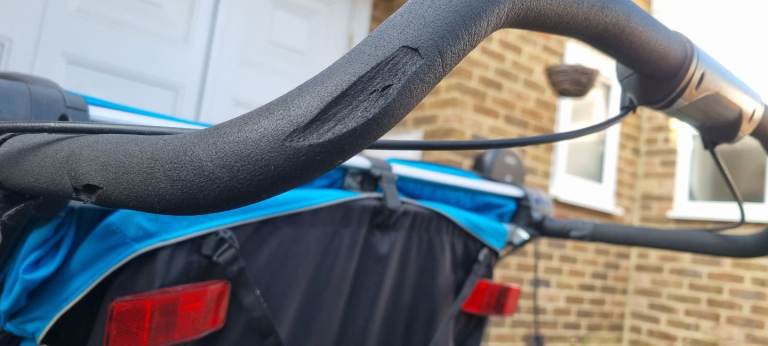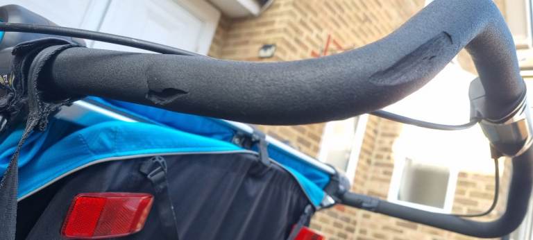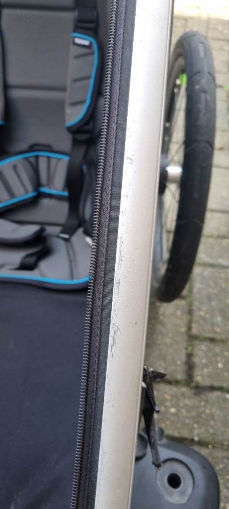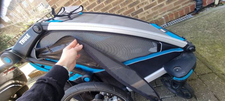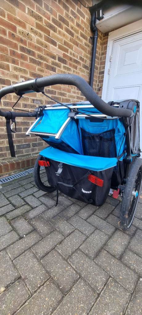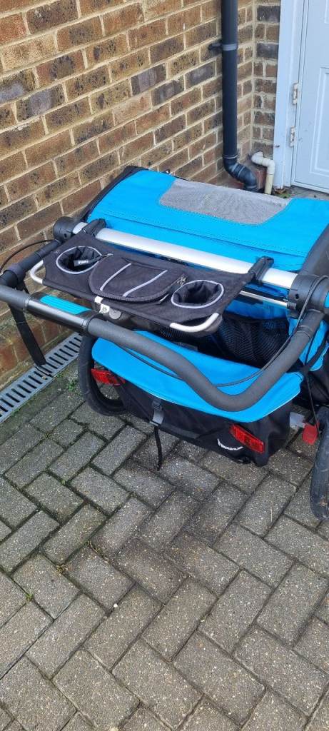 Double, high end, Sport version bike trailler. Year 2018. Multisport bike trailer designed for cycling, strolling and jogging (and I include all the attachments needed). It could also be used for skiing, but I do not have the required attachement. Very versatile, I have used it a lot as a double pram and for running, not only as a bike carrier. It has been very useful specially in winter and bad weather. Throw a blanket and some soft toys and you get a very cozy space for children. It is light and it moves surprisingly easily thanks to the big back wheels and 360 swivel front wheels. Literally, all terrain double pram. It has cosmetic marks due to use, in frame and in the foam handle (please see pics), but it is overall in very good condition with no critical damage (no dents, tears in fabric or working issues)