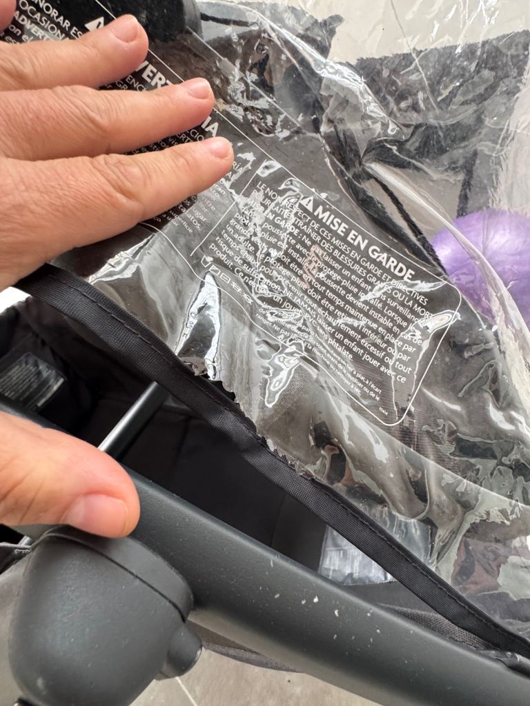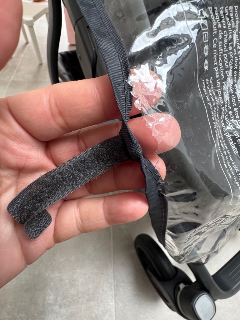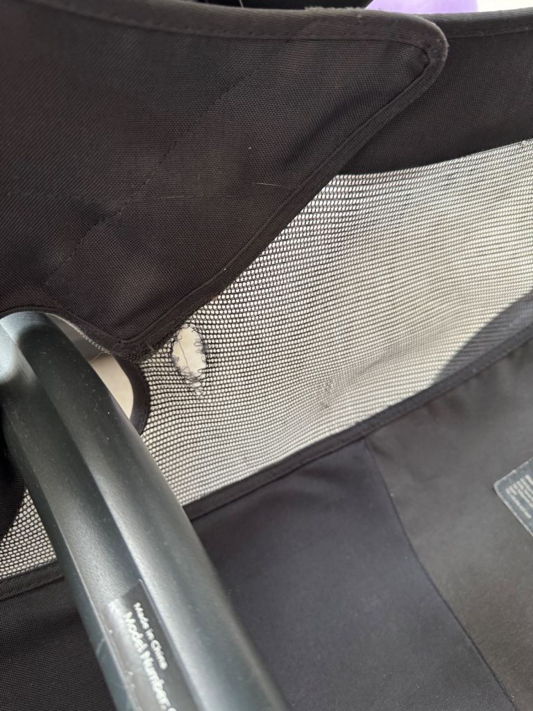 Seat rain cover has a small tear along the side where it came apart from the edge strip but that does not affect its use. As you can see in one of the photos the tear sits on the outside of the seat frame which prevents any water from reaching it.