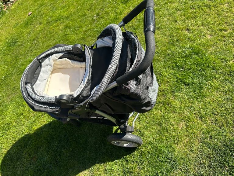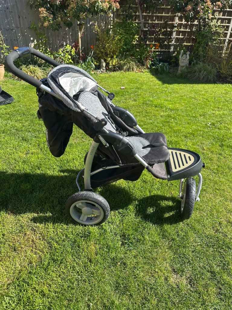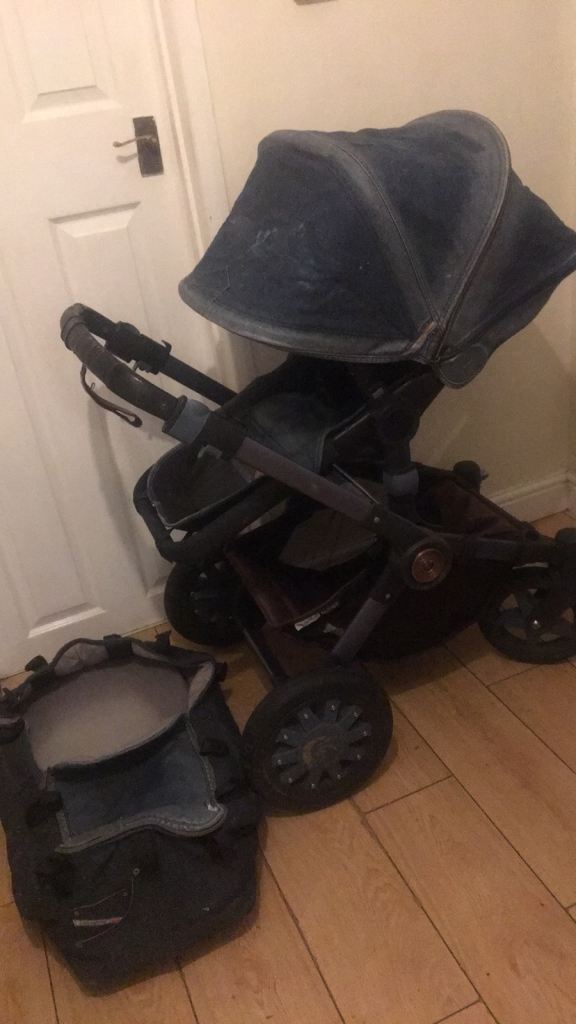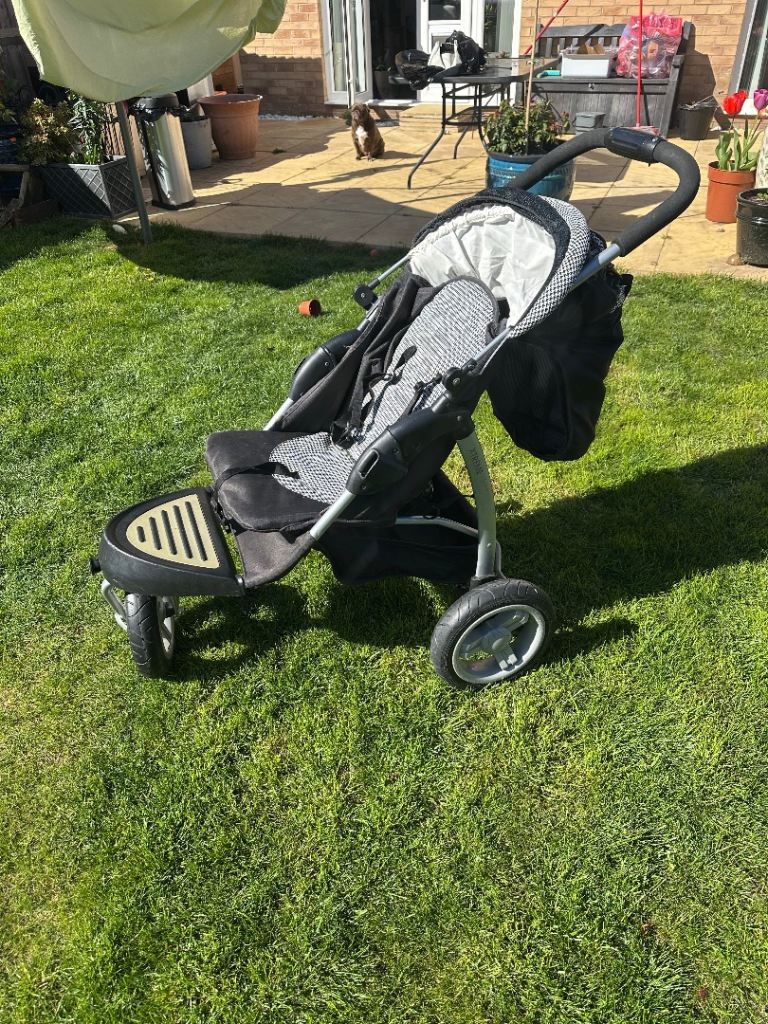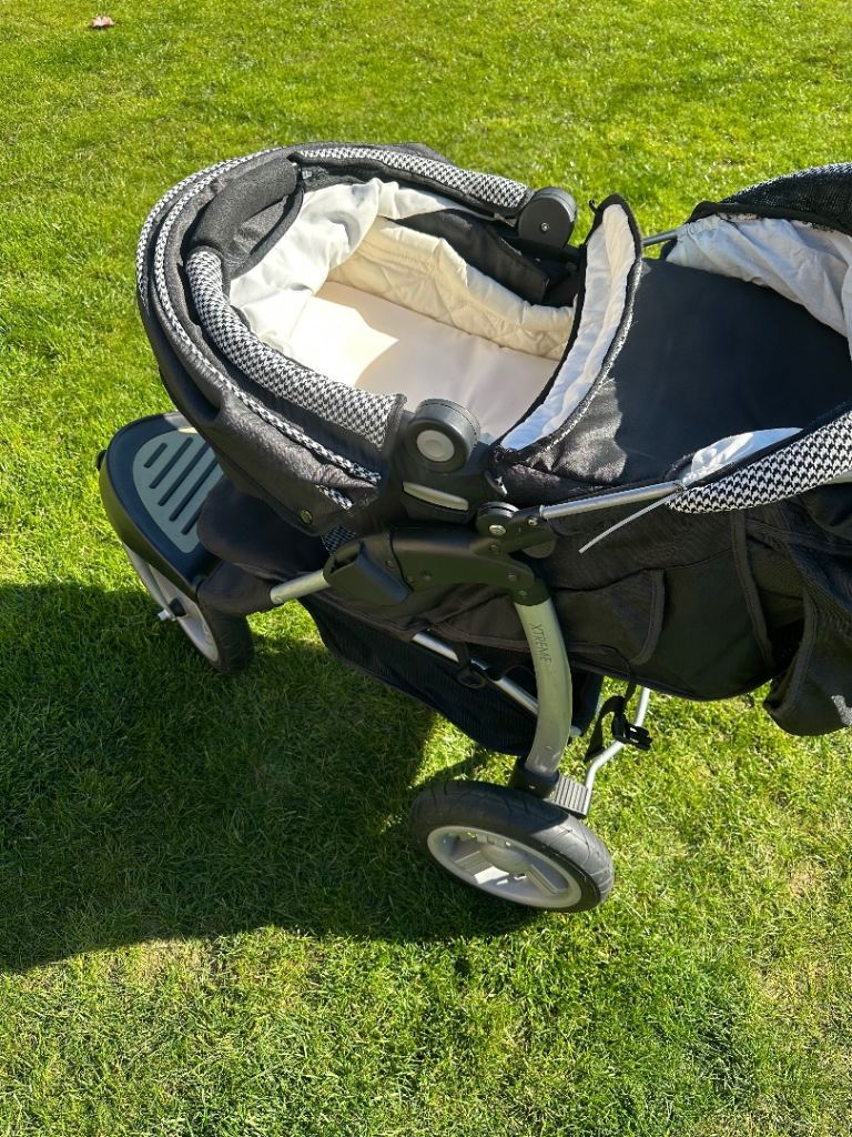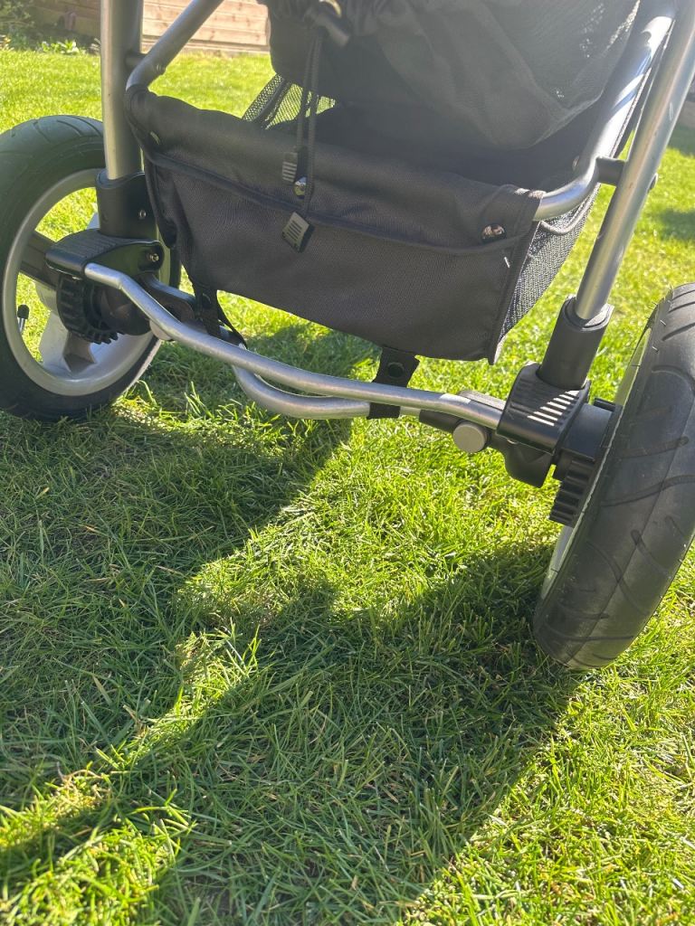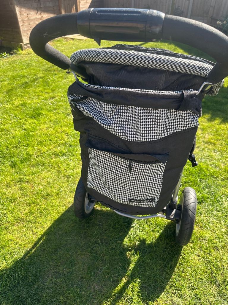 Pushchair with removable basket. Sun cover & storage bag on back.