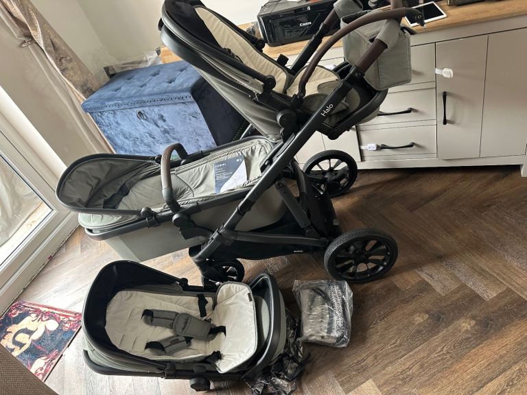 Comes with 2 x reversible seat units, 1 x carrycot, 2 x rain covers, cup holder, 2 x reversible seat liners, elevate & tandem & universal car seat adapters, stroller organiser and leatherette bumper bars.