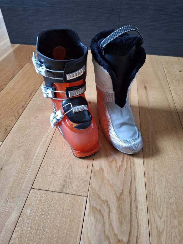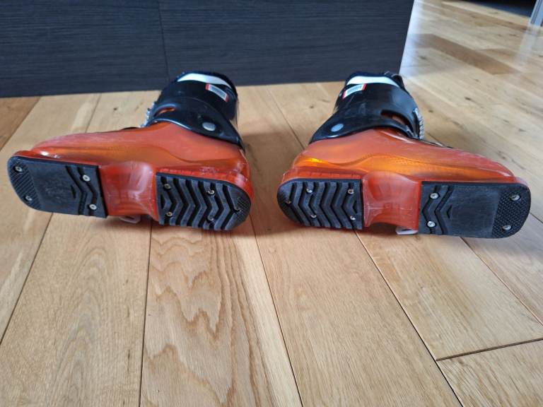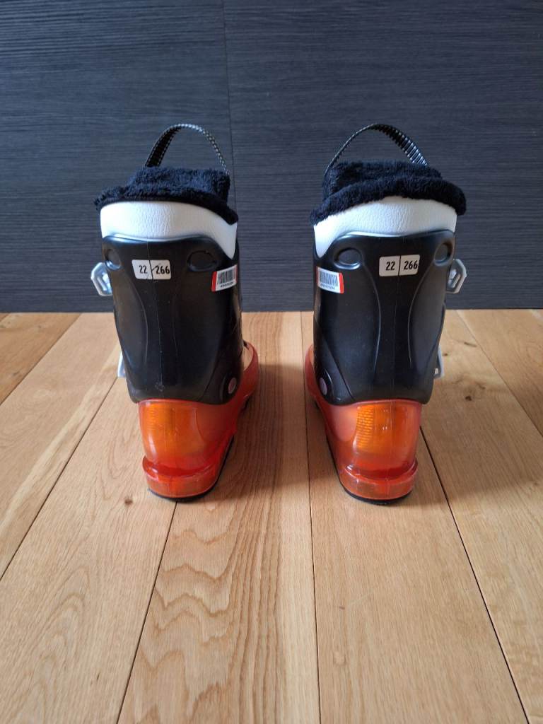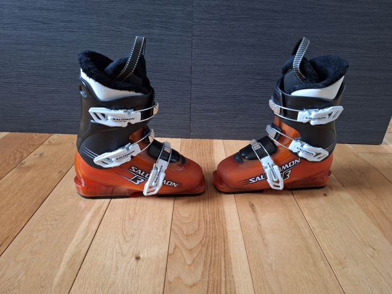 A pair of Salomon Junior Ski Boots in 'As New' condition. The boots are UK size 3 (Mondo 22) with a sole length of 266 mm. The inner boots are clean and fresh and all the buckles are intact. Very Light wear on the soles as the boots were only used for a few days.