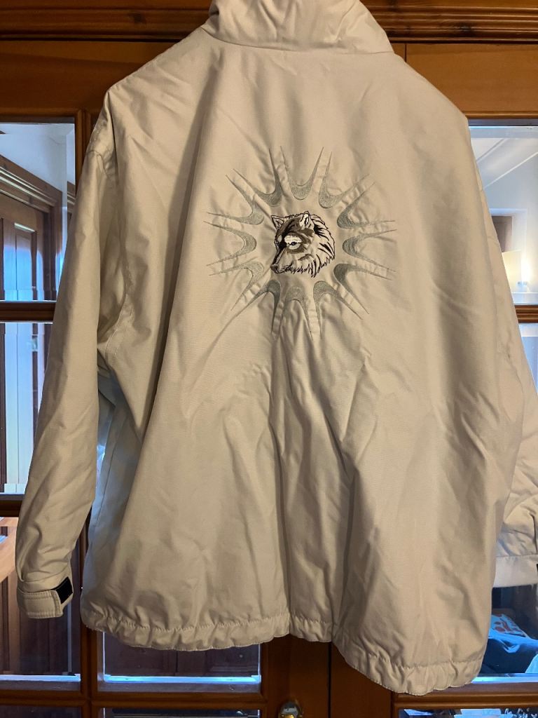 Off white hardly worn size medium 14/16 fleece lined ski jacket. Lovely embroidered wolf on the back.
