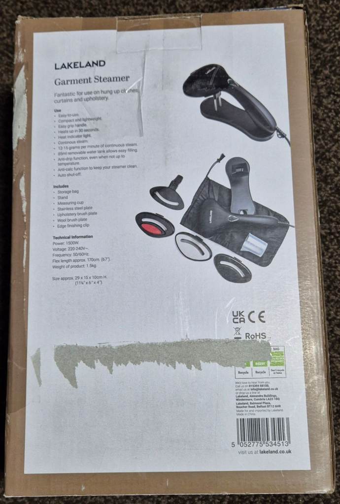 Introducing the Lakeland Garment Steamer, a lightweight and handheld clothes steamer suitable for all your garment steaming needs. With a capacity of 0.85L and dimensions of 28.5 x 14.5 x 10cm, this steam iron is perfect for ironing clothes and other fabrics with ease.