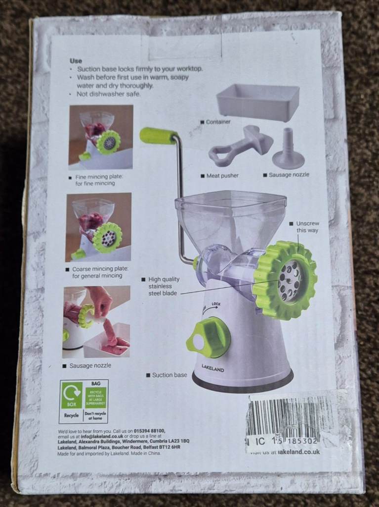 Grind your own meat and create your own sausages with the Lakeland Meat Mincer and Sausage Maker. This manual meat grinder comes with a white body and includes a mincer component for easy use. Perfect for those who love to cook and want control over the quality of their meat.