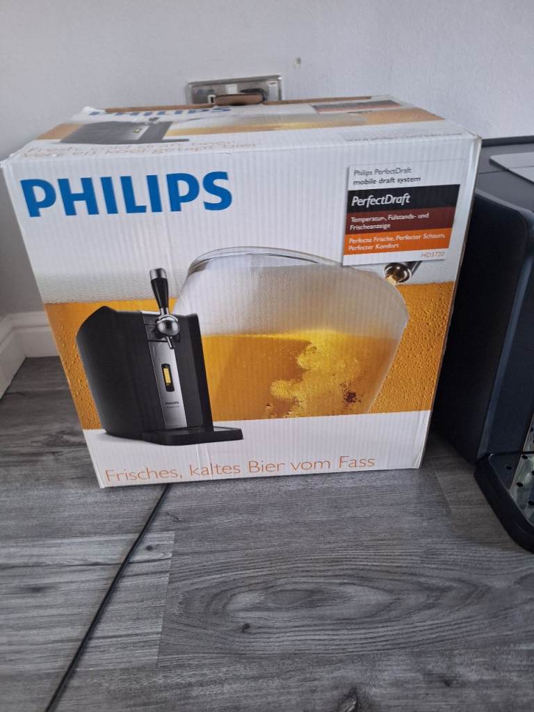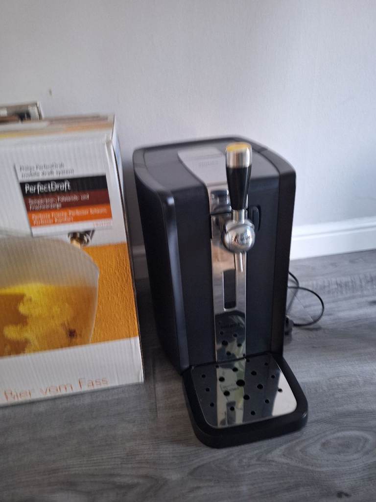 Phillips Perfect draft Beer machine, drip tray and 4 empty kegs which can be traded in £20 credit against a keg, comes in original box and instructions inside. pick up only.