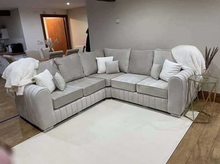 This grey corner sofa, is covered with Plush Velvet Fabric, and has design features: classical chrome legs, tufted buttons in chesterfield design, and low back comfort. These details make it a perfect choice for your living room.