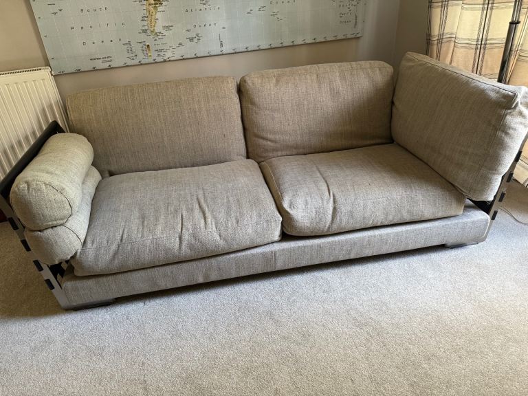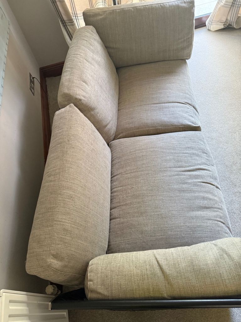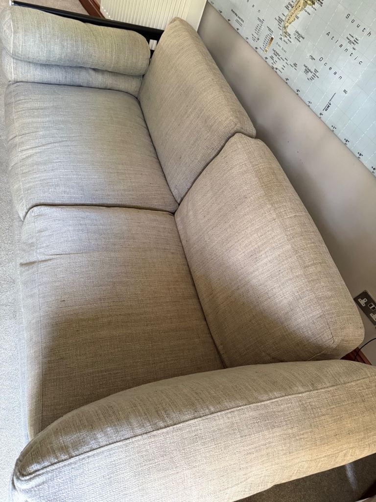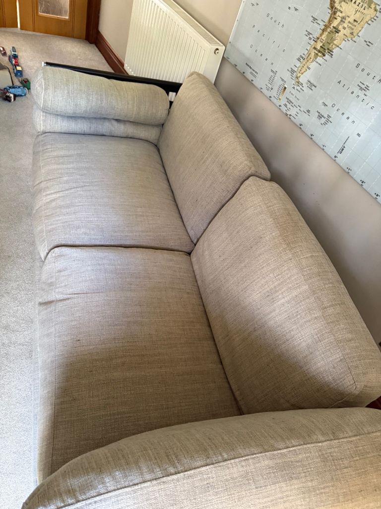Gorgeous large 2 or 3 seater sofa in a light stone colour. Originally bought from Harrods. In good condition, it has some stains on the base under the cushions, but they are not visible. It hasn't been used much, as it’s been in a spare room, so it's only been used occasionally.