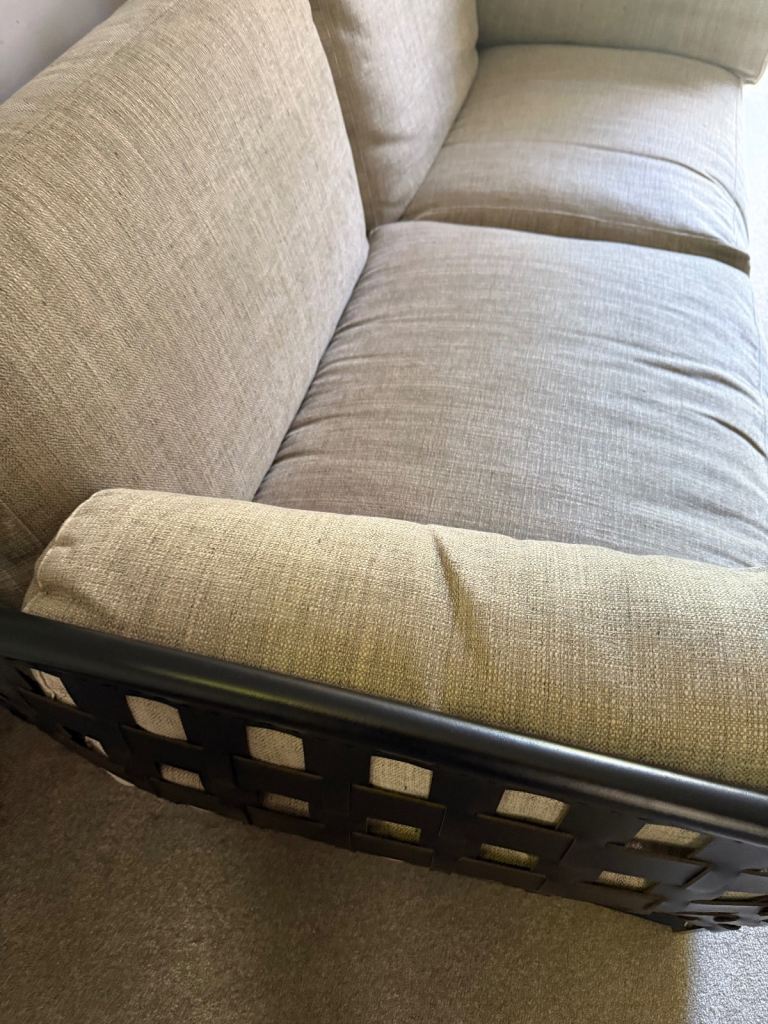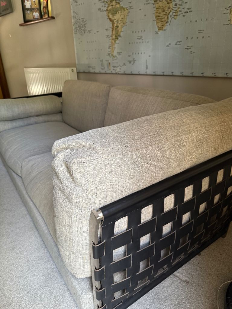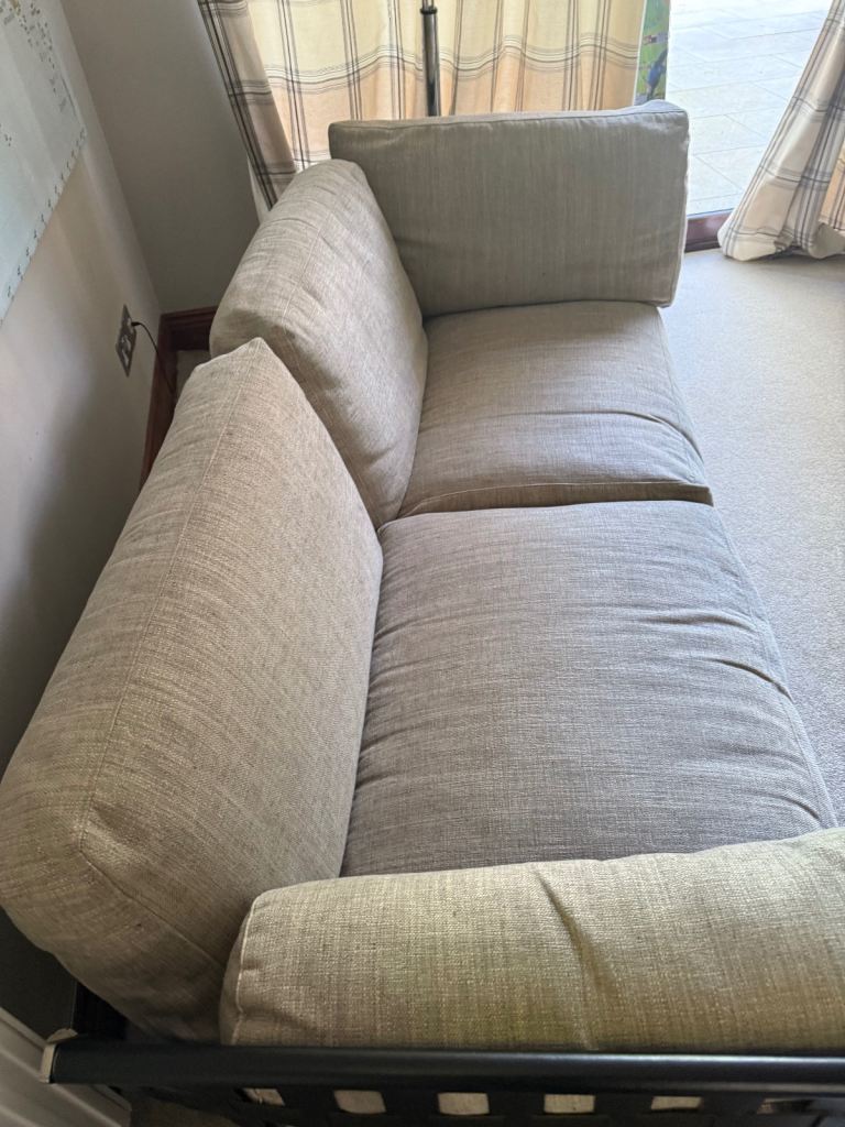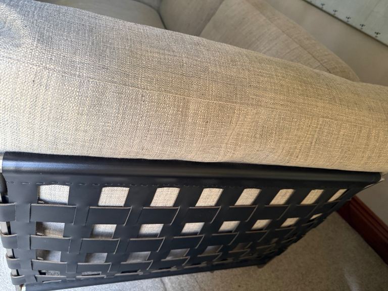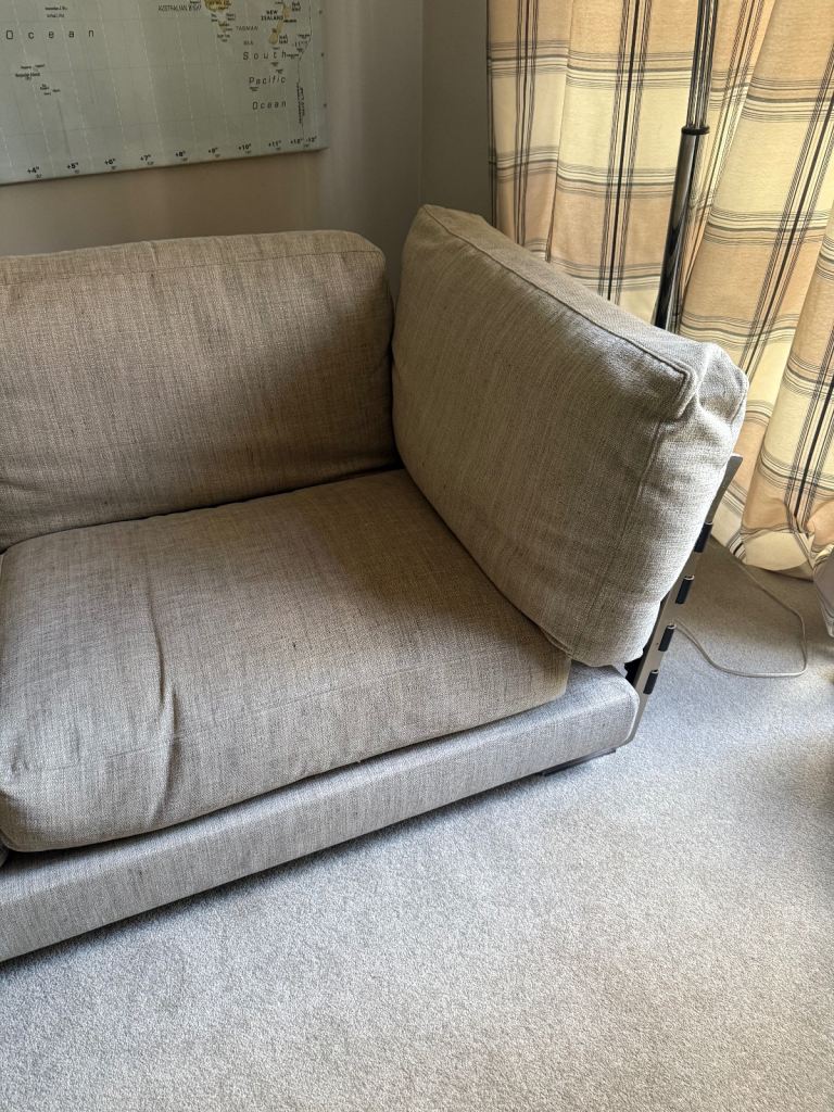 Gorgeous large 2 or 3 seater sofa in a light stone colour. Originally bought from Harrods. In good condition, it has some stains on the base under the cushions, but they are not visible. It hasn't been used much, as it’s been in a spare room, so it's only been used occasionally.