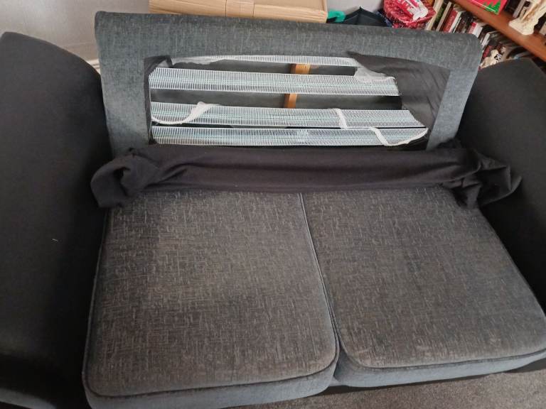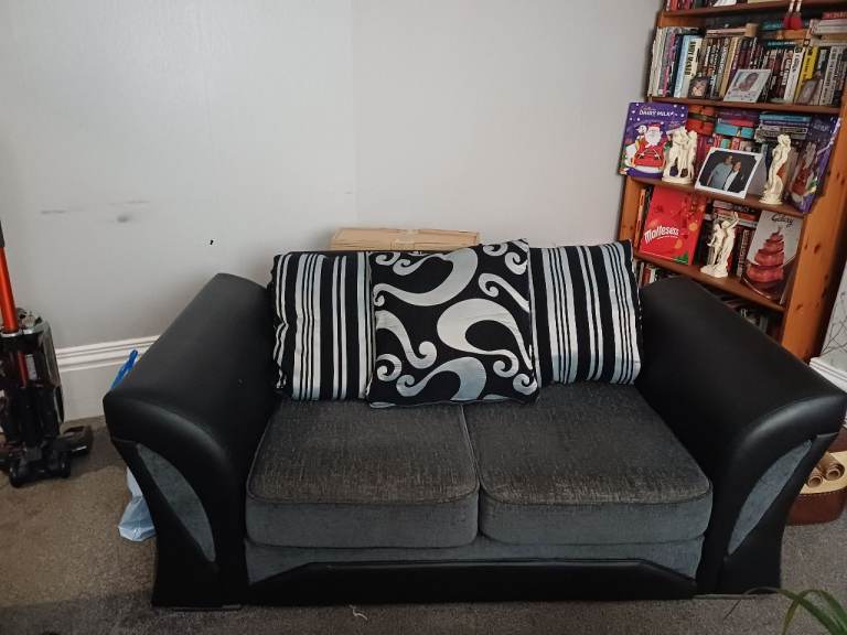 Black 2 seat setee,fabric with leather sides as you can see from the picture the back has worn over time so have used a black throw on the back to cover. Still in fair condition . Free ! Collection only