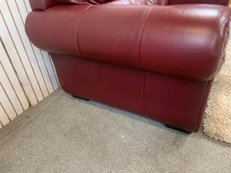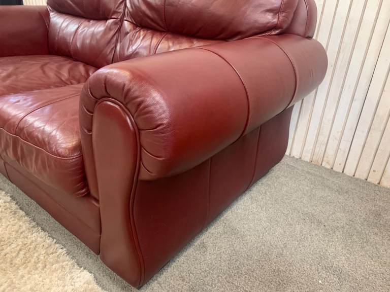 This 2 seater burgundy leather sofa is a luxurious addition to any living room. With a medium firmness level and a deep seat depth of 55cm, it provides a comfortable seating option for adults. The modern back style and red frame colour add a touch of sophistication to the piece, while the wooden frame ensures durability., this sofa is upholstered in high-quality leather and requires no additional parts or assembly for easy installation. Perfect for creating a cosy and stylish seating area in your home. Please note this sofa is Pre-loved has been used but still in good usable comfy condition.