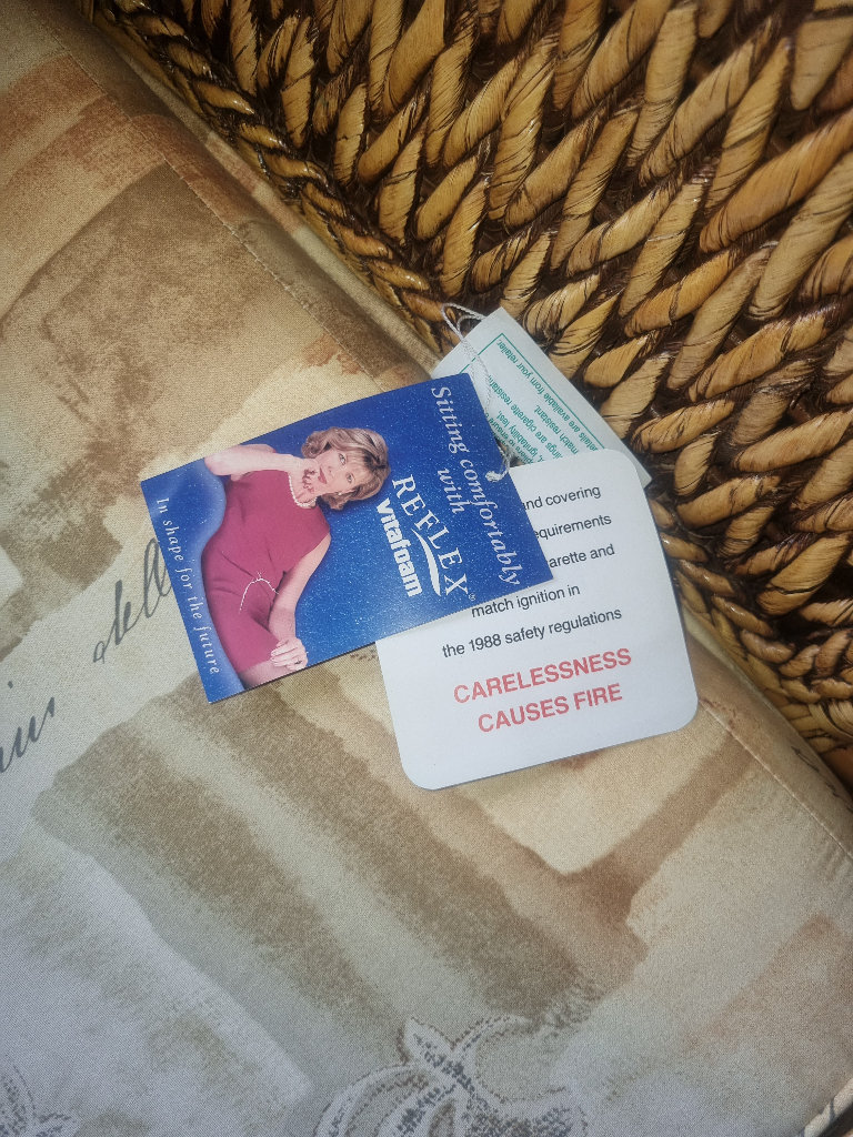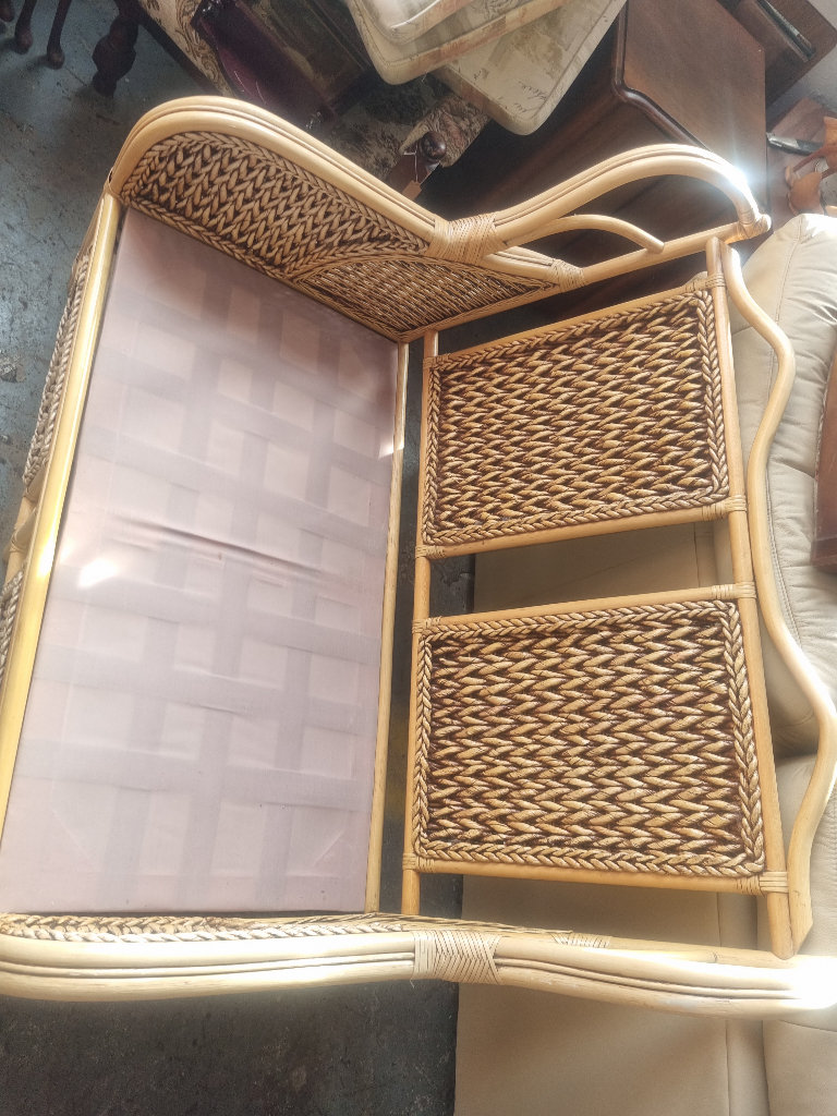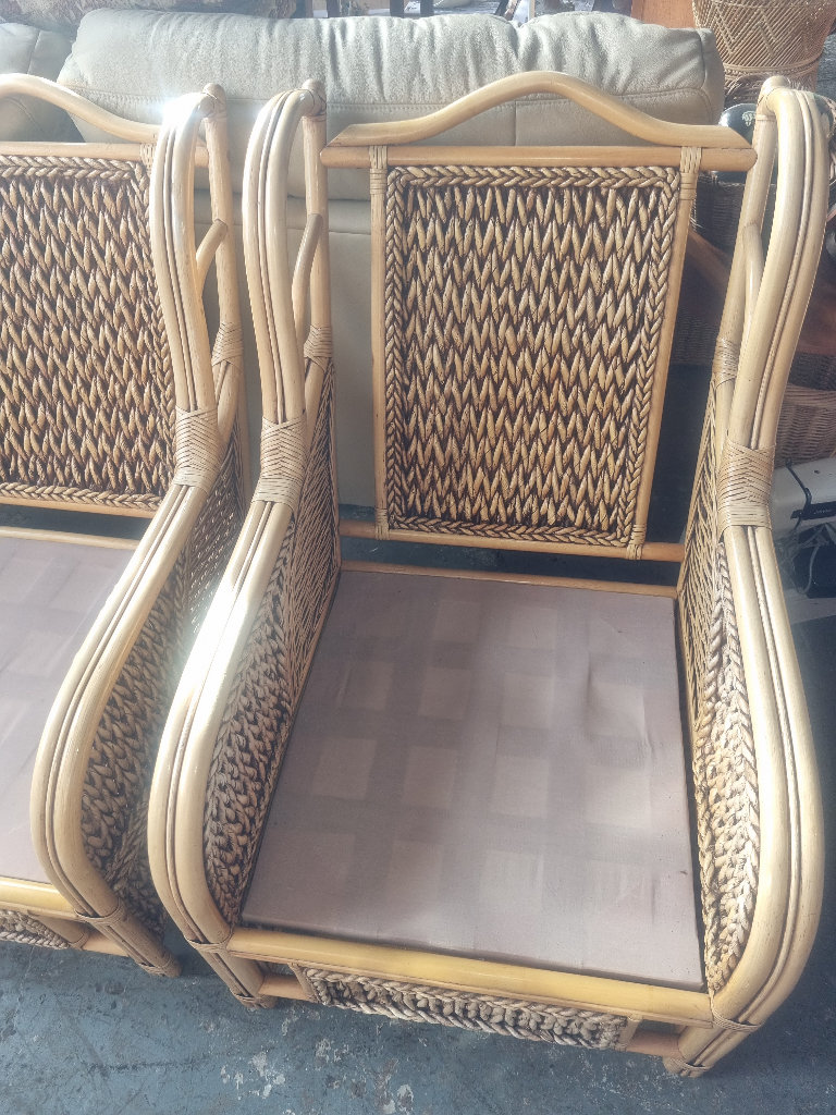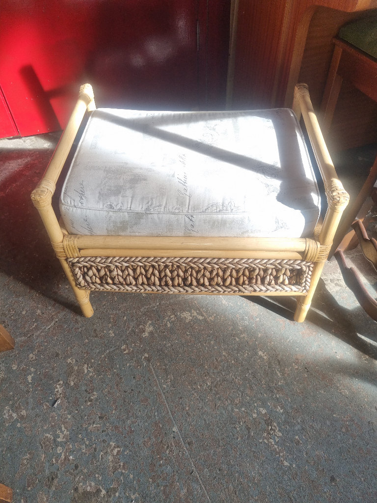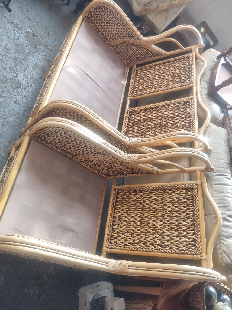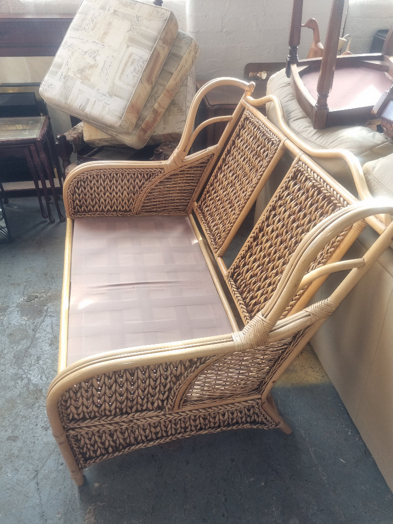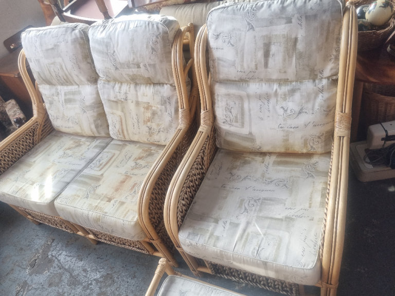 A nice 2 seater wicker sofa and chair with footstool. Fire Resisting labels intact, no rips to fabric or base, in good overall condition and really comfortable to sit on.