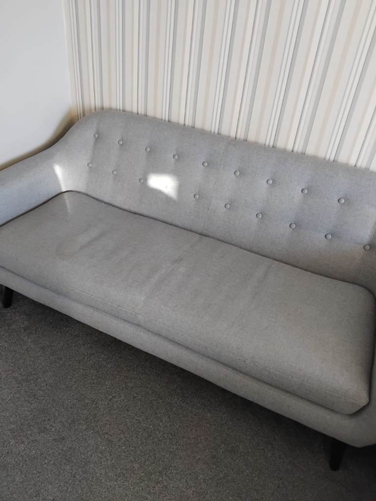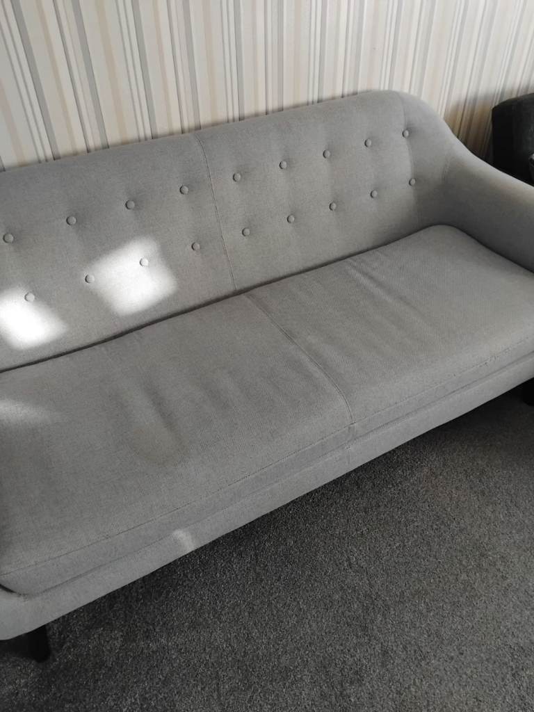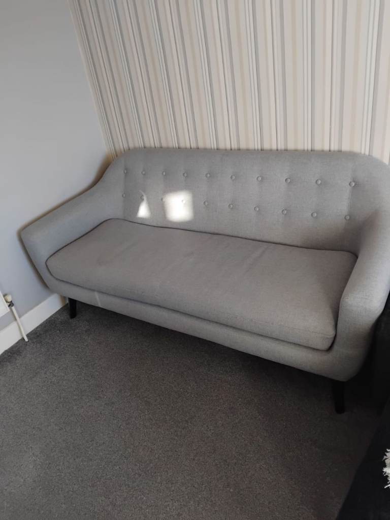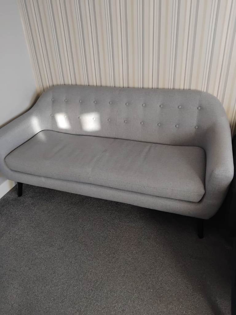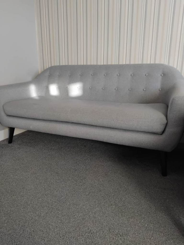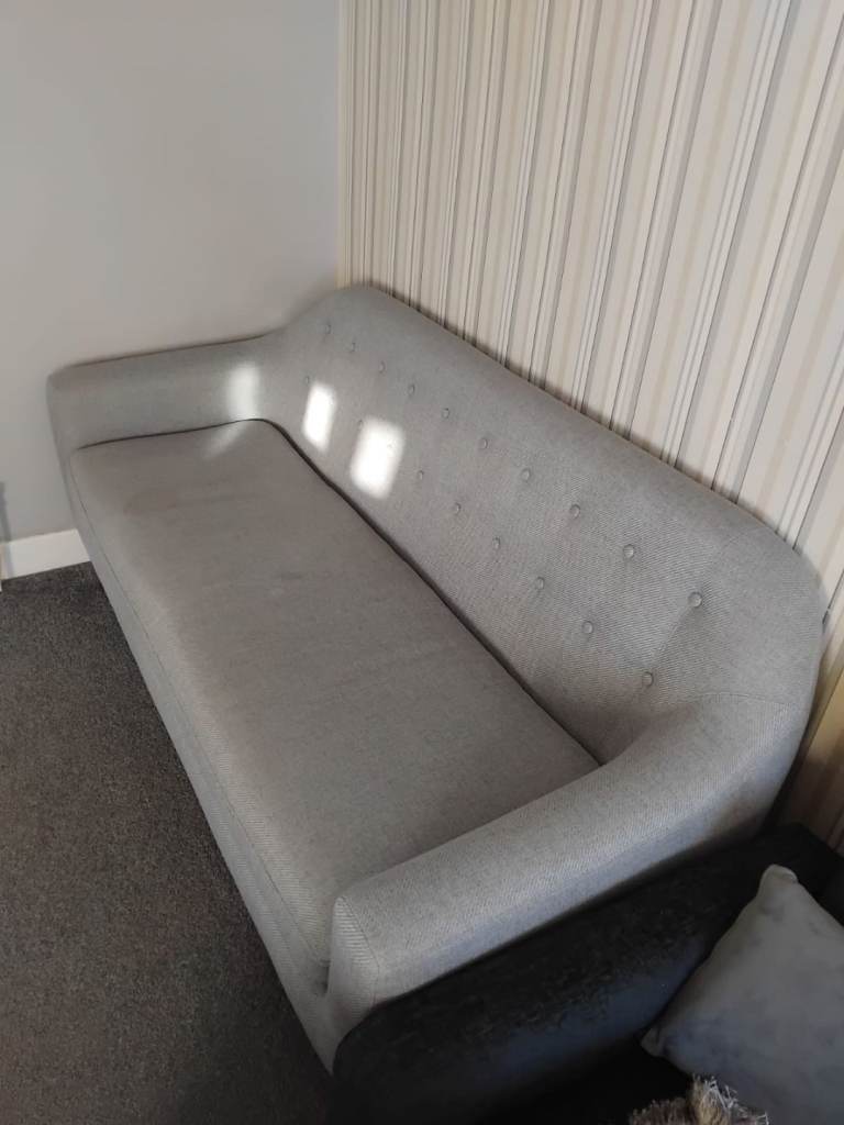 3 Seater modern designed sofa on a grey upholstery with back plastic frame feet