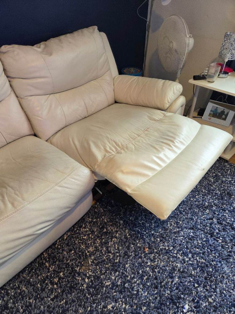 3 x 2 leather sofa cream 2 seater hardly ever used its about 8 years old H 90cm x width 87cm x length 150 cm width with recliner out is about 130cm both seats recliners work.