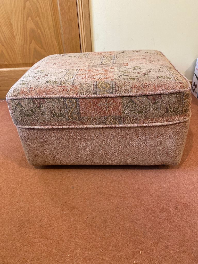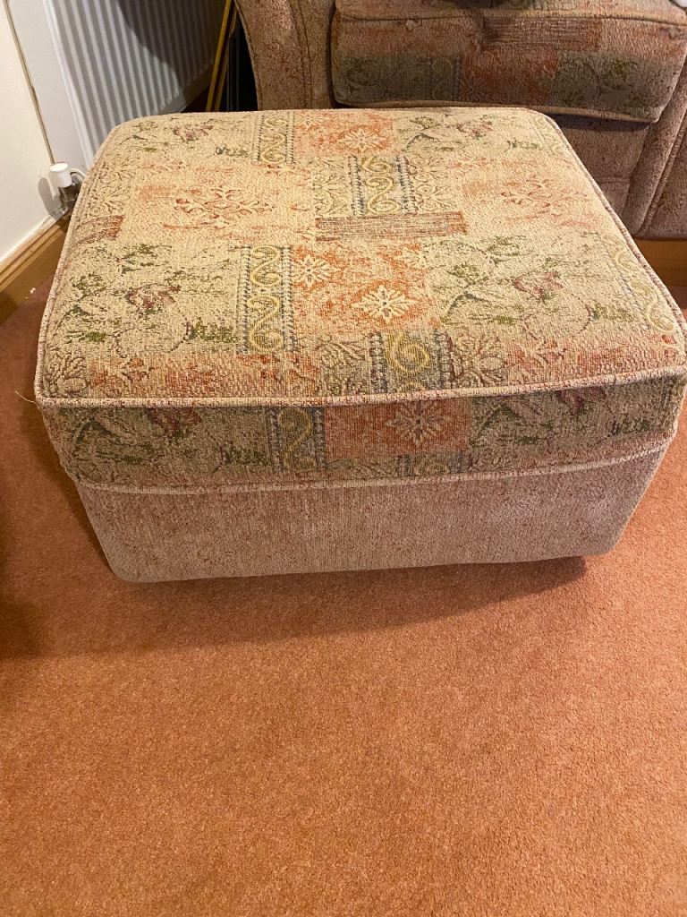4 PIECE SUIT, 2 PIECE SUITE, 1 LARGE CHAIR MATCHING AND LARGE FOOTSTOOL.