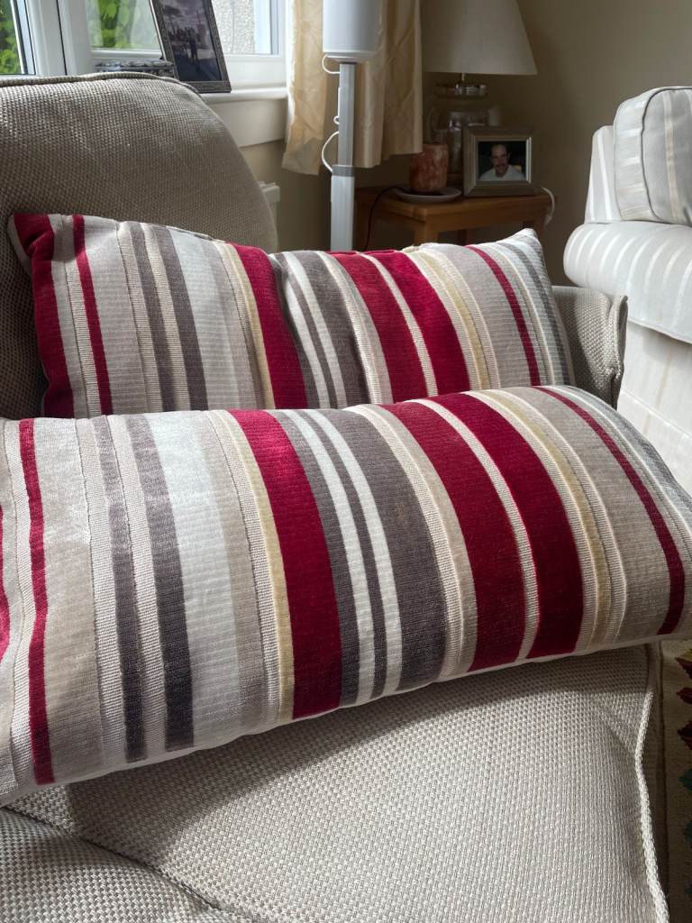 Lovely quality velour cushions 2 x cranberry multi - coloured and 1 x plain cranberry.