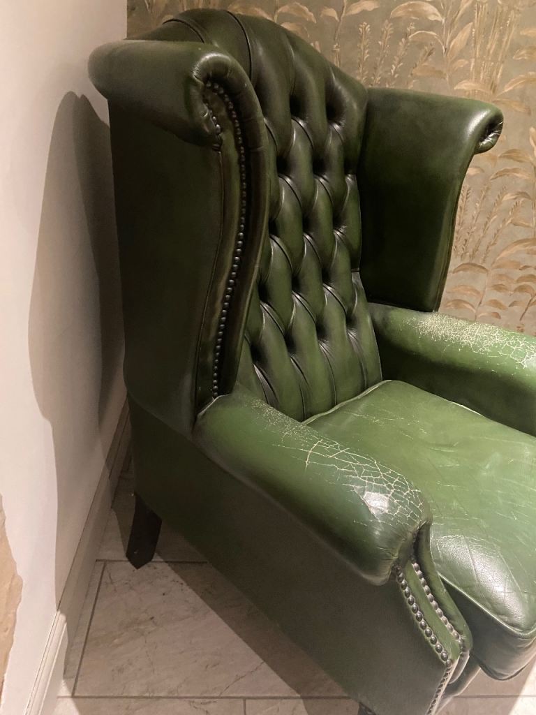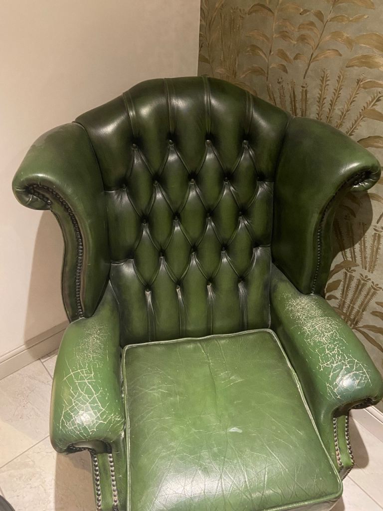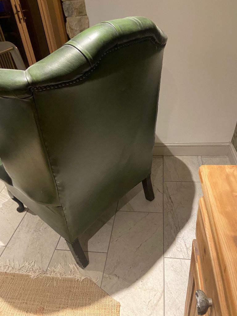 Beautiful Green Leather Chesterfield Winged arm chair QUEEN ANNE