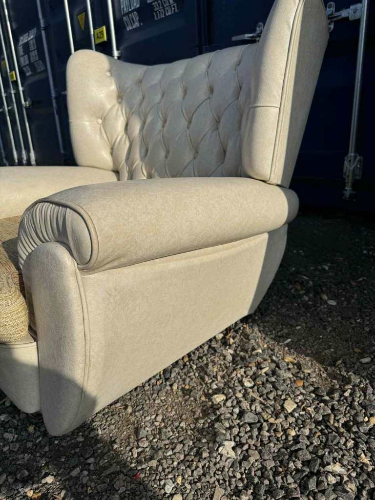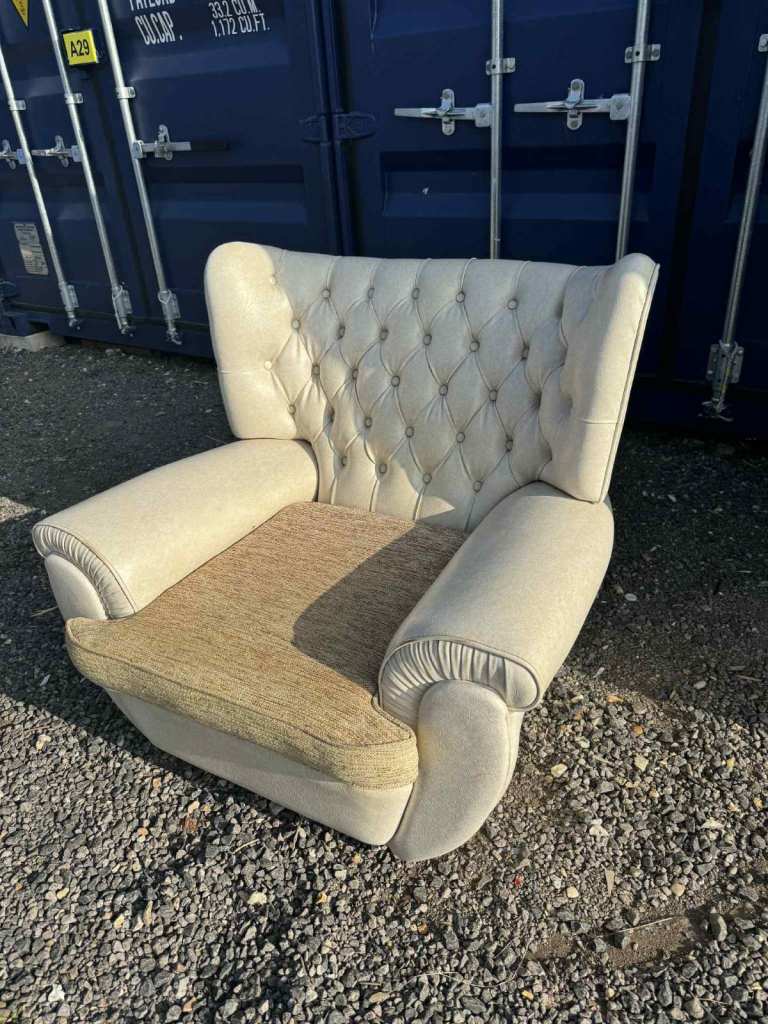 Comfortable beige armchair with tufted back. 100x100 , h81 cm floor to seat 36cm. Collection at BN164AT or can be delivered for a fee.