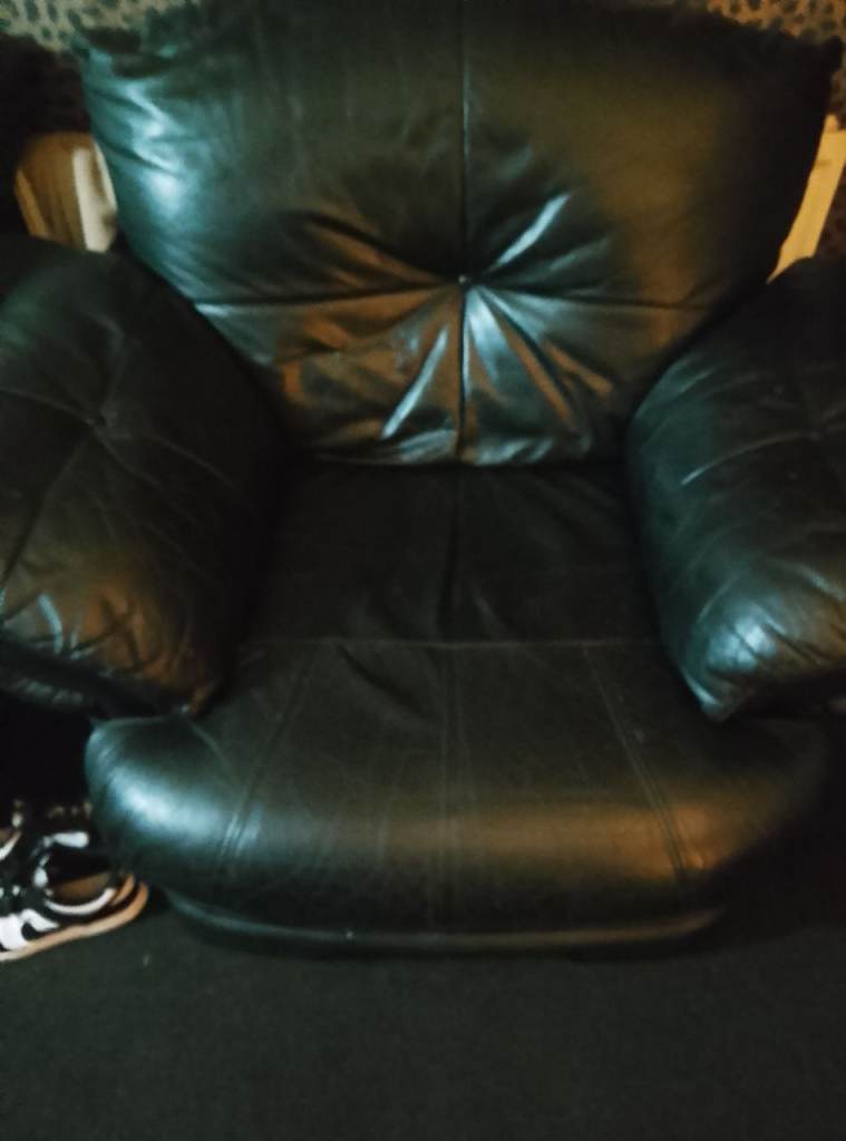 Black leather suite good condition comfy and durable the cushions can come off for easy removable get in touch if want to buy sorry about the light in the photos the suite is black just need it away will need a van to pick up not holding for anyone