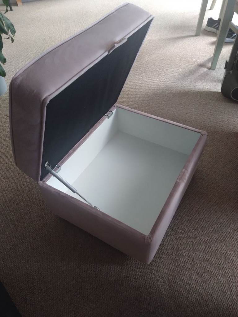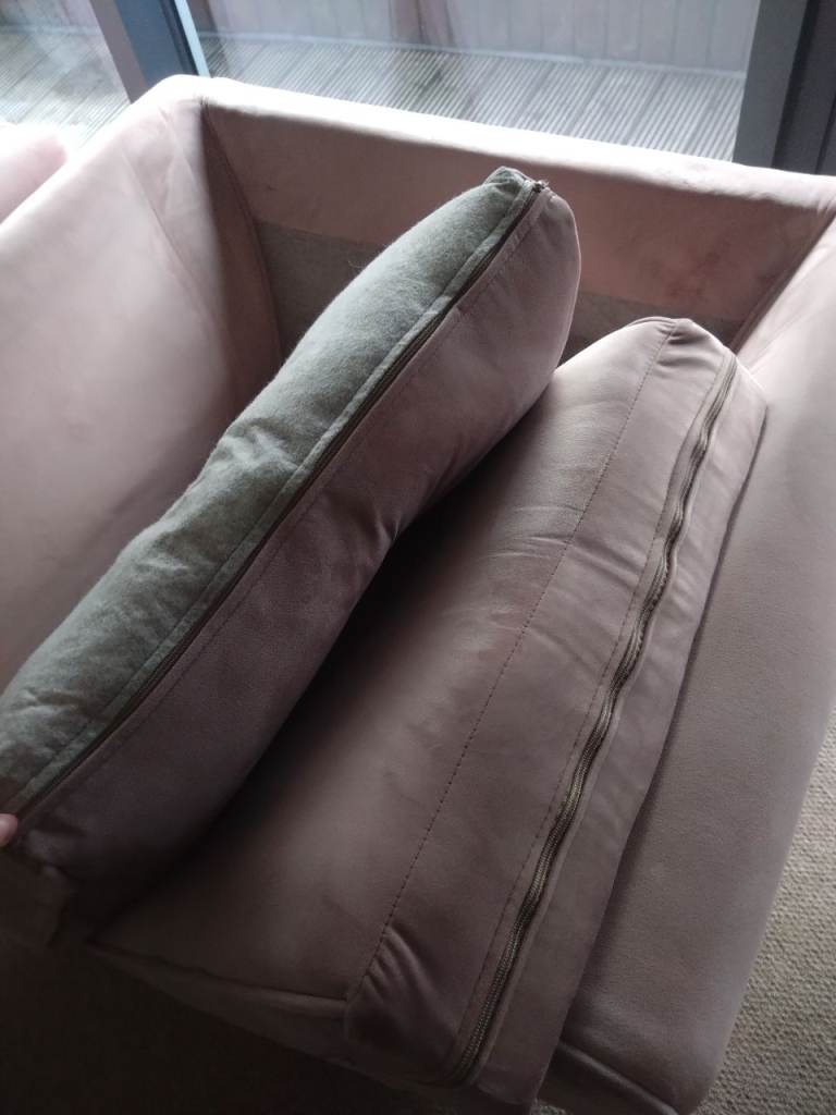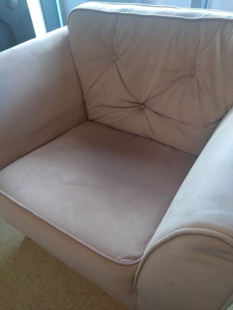 Posting for 4+ monthsBlush pink velvet armchairs (2) and matching footstool with storage